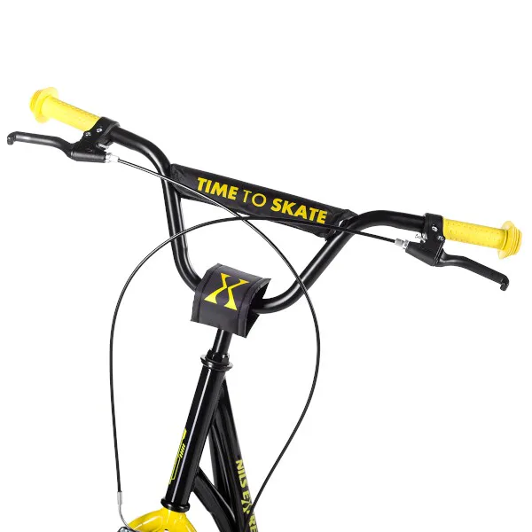 Koloběžka NILS Extreme WH118A má nosnost 80 kilogramů a je tak určená pro děti a dorost. Rám, vidlice a řídítka jsou vyrobeny z kvalitní oceli. 16" a 12", hliníkové ráfky jsou obuty pumpovanými pneumatikami, které zaručují vysoký jízdní komfort a snadné překonávání drobných nerovností. Model WH118A je tedy ideální volbou pro jízdu po asfaltových silnicích, dlážděných městských uličkách, ale i po lesních stezkách.WH118A je opatřena přední a zadní brzdou typu "V-Brake", sklopným stojánkem a molitanovým chráničem na trubce řídítek. Gumové gripy zajišťují pevný a pohodlný úchop.