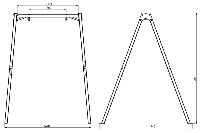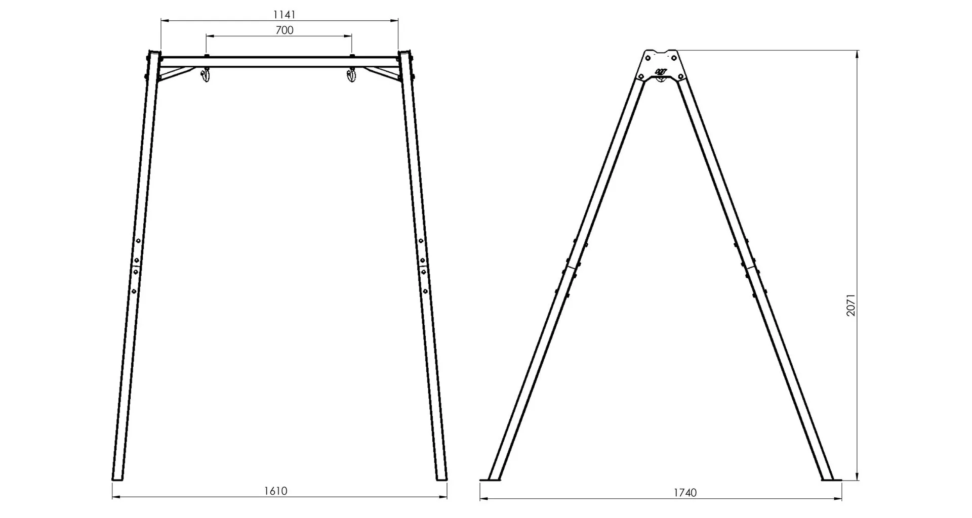Horní spoje mezi nohami a příčníkem byly navíc zesíleny dvěma ocelovými konzolami, což zvyšuje stabilitu konstrukce a zajišťuje bezpečné používání. Nabízený výrobek je vysoce kvalitní, odolná a bezpečná konstrukce z ocelových profilů o průřezu 50 x 50 x 2 mm zaručuje nosnost až 200 kg. Celková výška konstrukce je více než 2 metry, takže ji mohou pohodlně používat jak nejmenší, tak i o něco starší děti. Vodorovný nosník svírá s nohami tupý úhel, což výrazně zvyšuje stabilitu celé konstrukce. Rám byl opatřen práškovou barvou, která zvyšuje jeho odolnost proti povětrnostním vlivům a poškrábání.