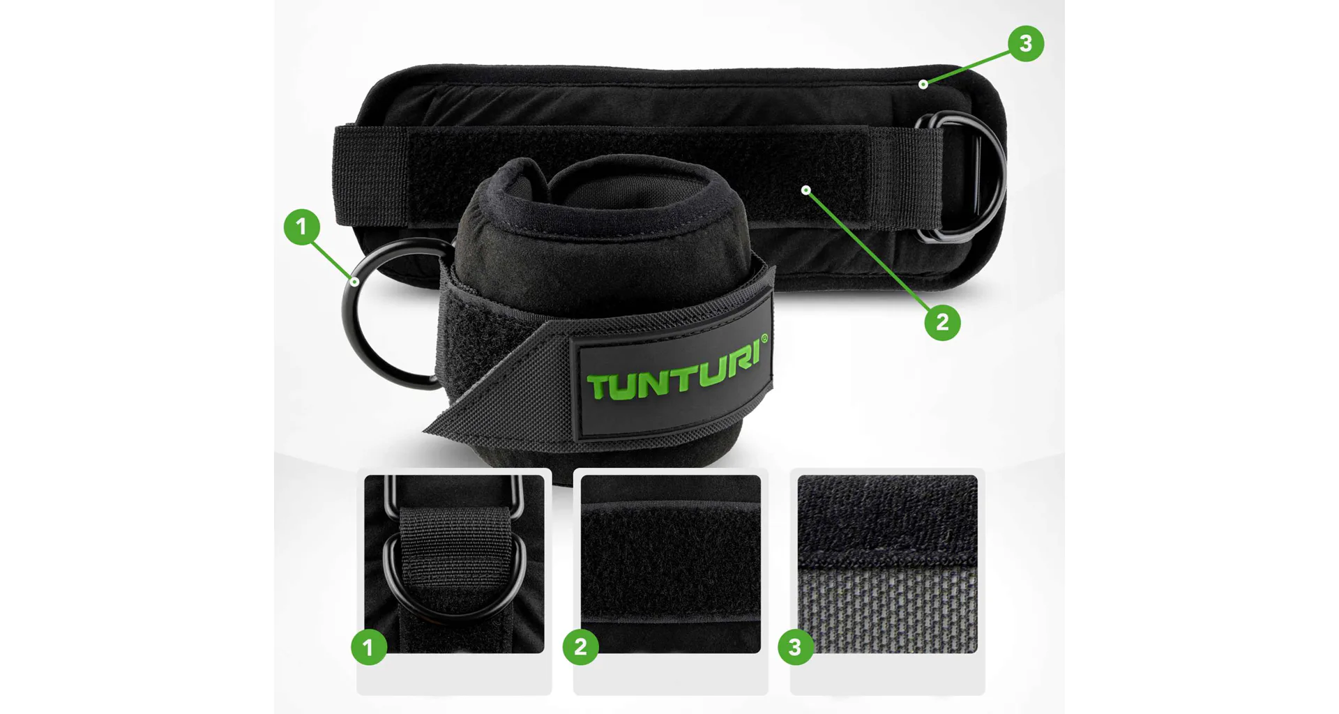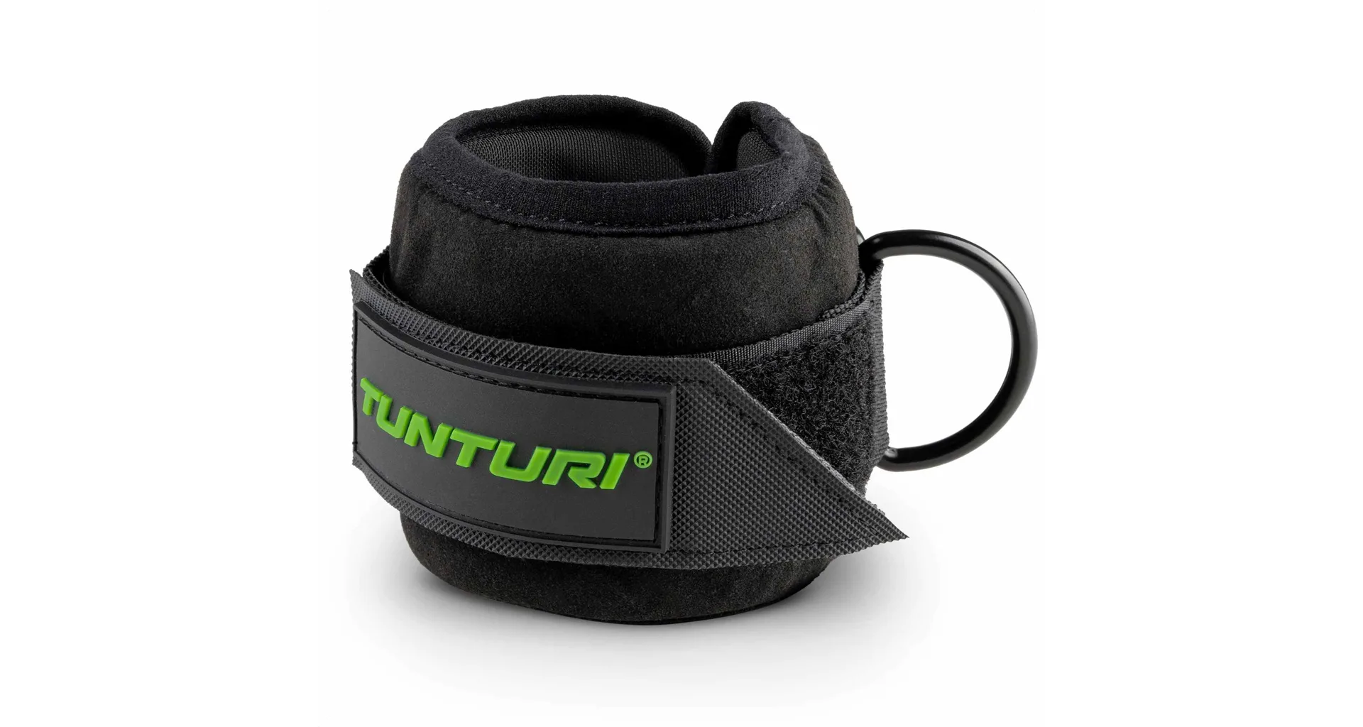 TUNTURI kotníkový adaptér – praktický a komfortní cvičební doplněk pro trénink na posilovacích strojích a kladkách. Popruh se jednoduše připevní na kotník pomocí suchého zipu a do pevné ocelové spony se upevní konec kladky. Tento adaptér je ideální pro efektivní posilování a protahování nohou, především stehen.