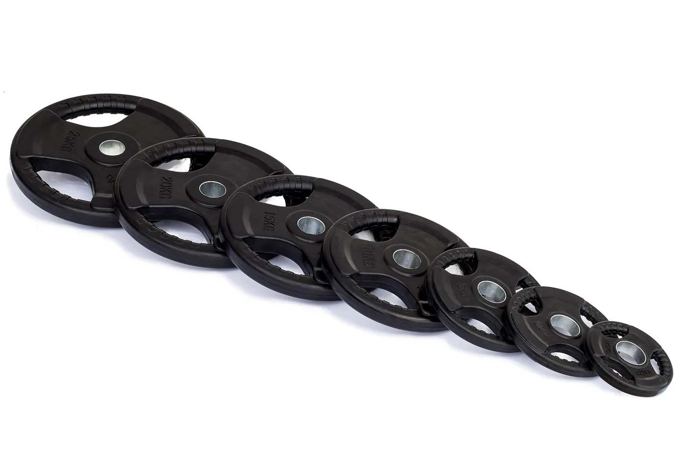 Profesionální pogumované olympijské kotouče s úchopy jsou vhodné pro všechny typy činek s průměrem 50 mm. Kotouče mají kvalitní povrchovou úpravu pogumováním se zvýšenou odolností proti opotřebení a zvýšenou trvanlivostí zaručující akustický komfort a odolnost. Kotouče jsou určené pro komerční i domácí využití. Ergonomický úchop umožňuje bezpečnější a snadnější manipulaci.