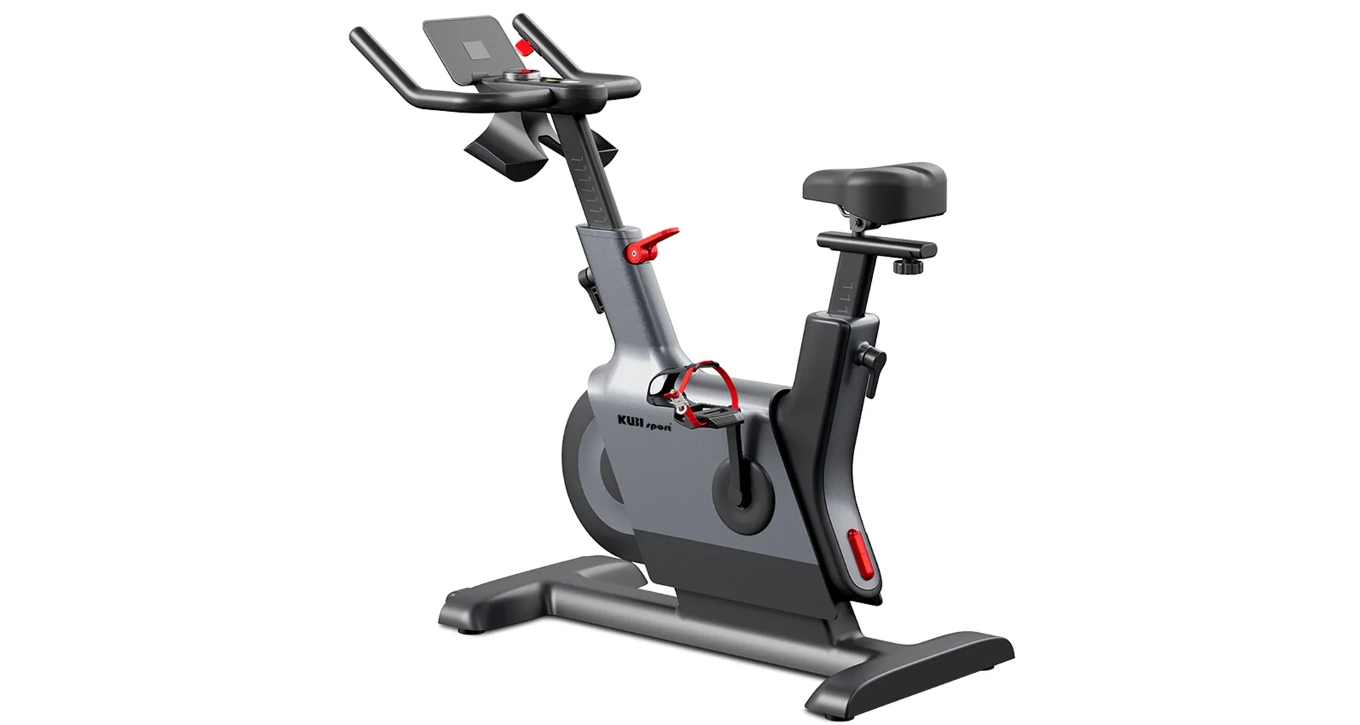 Konstrukce zařízení zahrnuje 6 kg setrvačník s magnetickým brzdným systémem, což zajišťuje tichý a plynulý chod. Nastavitelné sedlo ve dvou osách a výškově nastavitelná řídítka umožňují ergonomické nastavení pro různé typy postav. Pevná ocelová základna s transportními kolečky usnadňuje manipulaci a stabilitu během cvičení. Integrovaný držák na tablet a držák na pití zvyšují komfort uživatele. Trenažér má rozměry 120 x 47 x 118 cm, hmotnost 37,5 kg a maximální nosnost 150 kg.