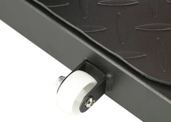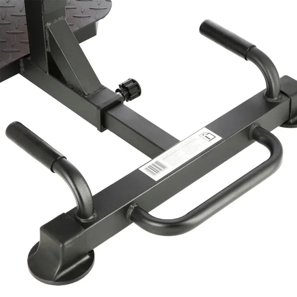 Robustní ocelová konstrukce stojí na plastových koncovkách, které chrání podlahu před poškozením a zároveň zajišťují vysokou stabilitu lavice. Přední stabilizátor je osazen transportními kolečky, zatímco zadní stabilizátor je opatřen uchem pro snadné přesunutí lavice, pokud ji zrovna nepoužíváte. Zadní část rámu jde zasunout, aby lavice zabírala opravdu minimum místa. Platforma je vyrobena z drážkovaného plechu, který zamezuje klouzání bot. Na polstrování je použita hrubá deska, s vysokou vrstvou PU pěny pro maximální komfort, PU pěna je také použita na zarážky nohou.