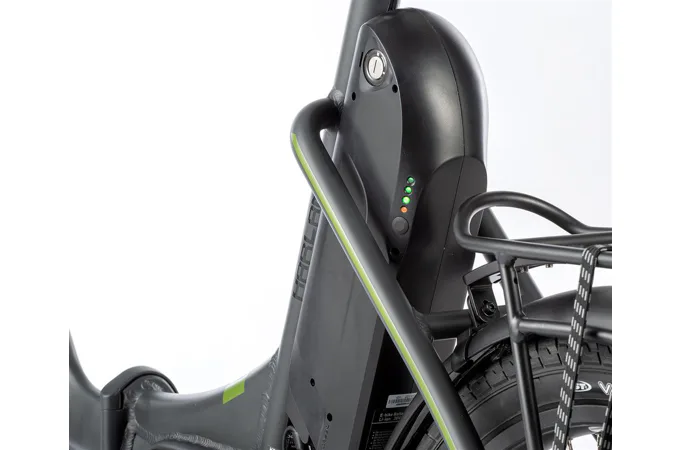 Baterie Leader Fox HARLAN disponuje kapacitou 14 Ah (504 Wh), 36 V a je umístěná na sedlové tyči. Tato pozice je ideální pro vyváženost hmotnosti baterie a se zárukou dobré manipulace s kolem.