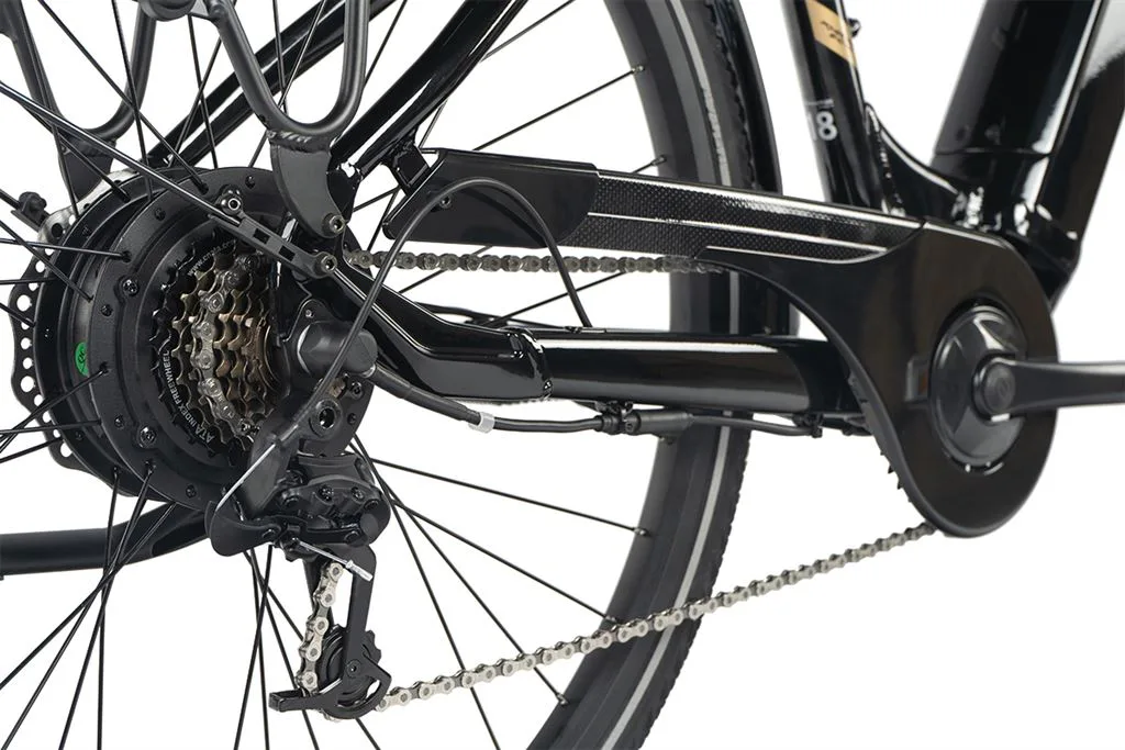 Pohon elektrokola INDUKTORA tvoří zadní motor Bafang 250 W (max. 350 W). Motor je umístěn v zadním náboji a zajišťuje výborné jízdní vlastnosti se silným výkonem.