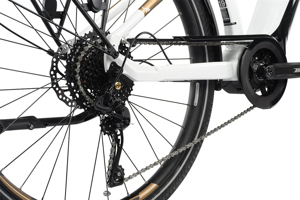 Komfort e-biku zajišťuje bohatá základní výbava s odpruženou vidlicí, kotoučovými brzdami a stabilními 28“ zapletenými koly.