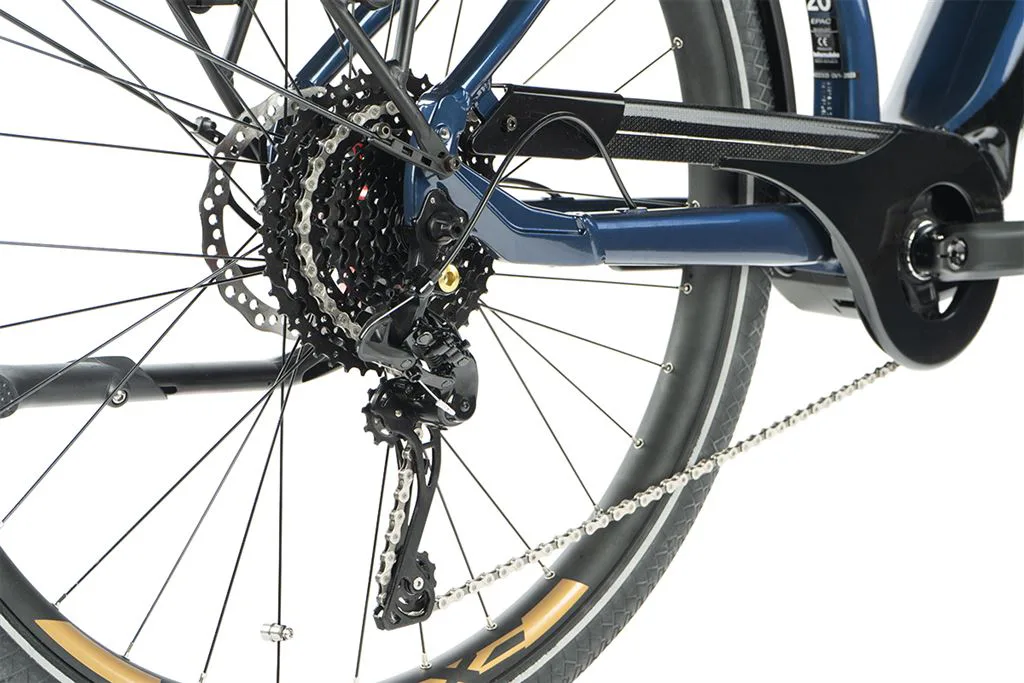 Komfort e-biku zajišťuje bohatá základní výbava s odpruženou vidlicí, kotoučovými brzdami a stabilními 28“ zapletenými koly.