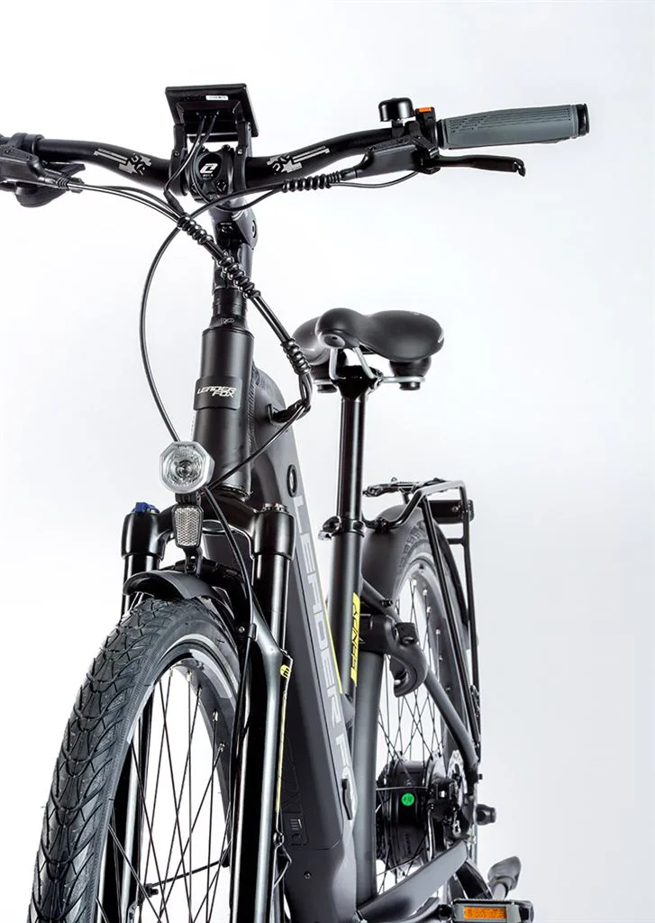 Komfort e-biku zajišťuje bohatá základní výbava s odpruženou vidlicí, kotoučovými brzdami a stabilními 28“ zapletenými koly.
