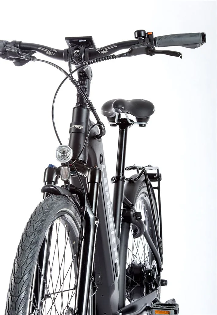 Komfort e-biku zajišťuje bohatá základní výbava s odpruženou vidlicí, kotoučovými brzdami a stabilními 28“ zapletenými koly.