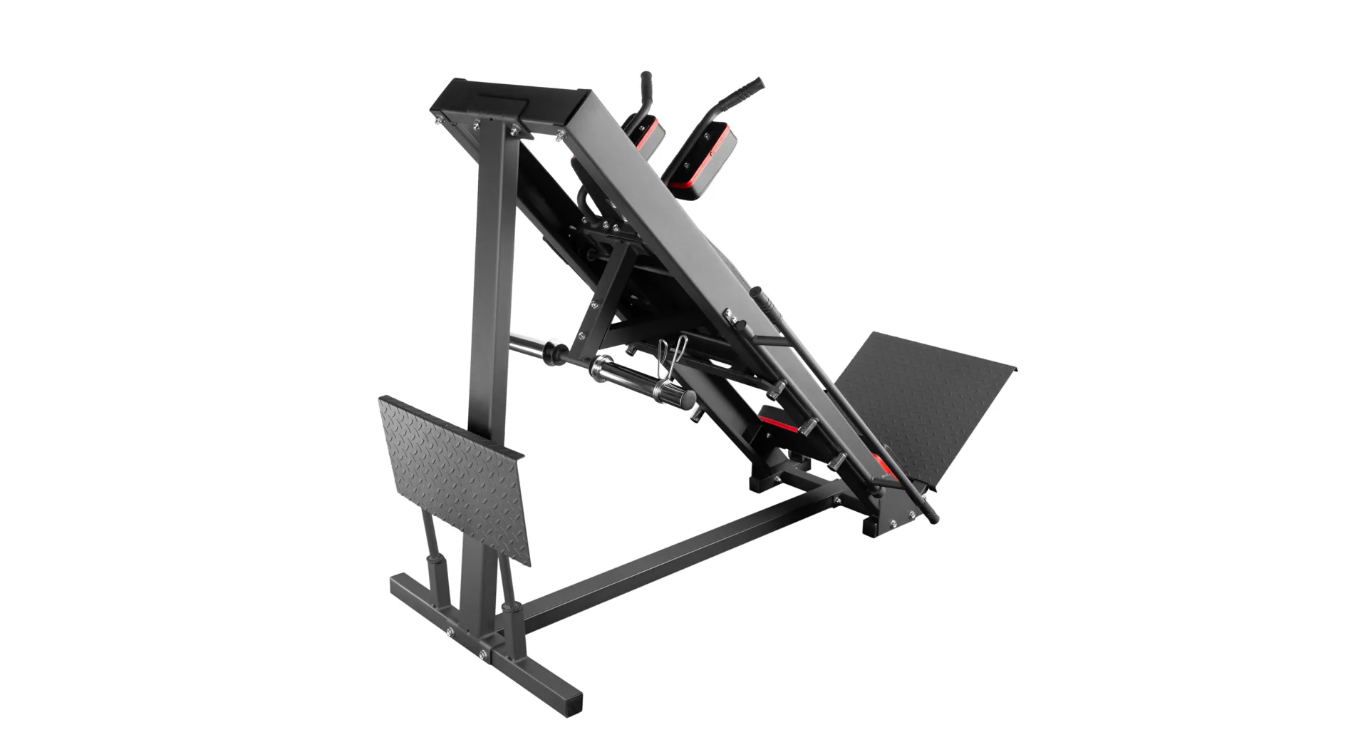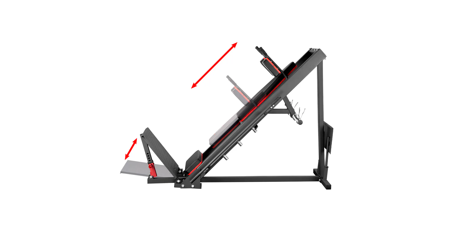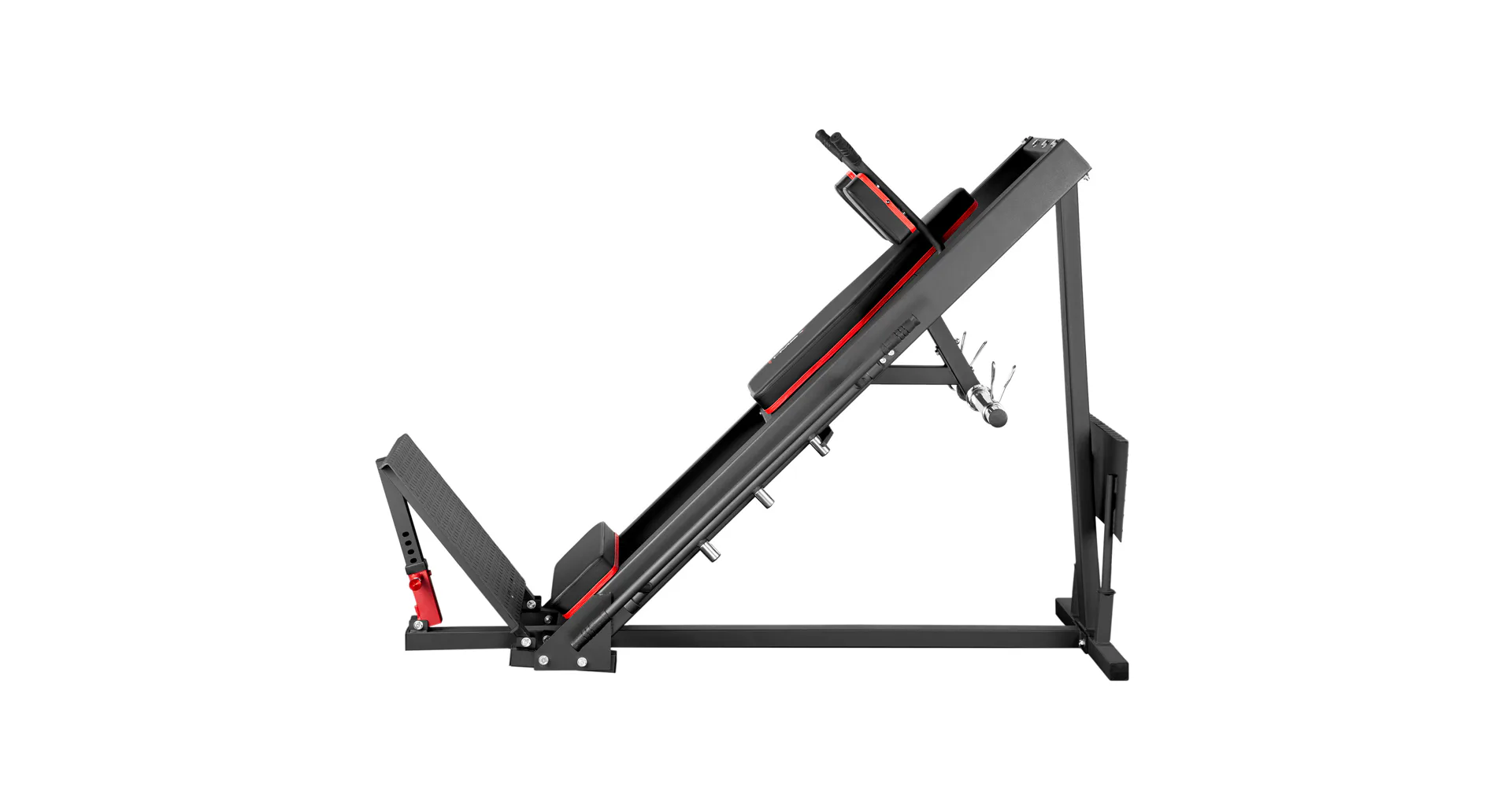 Stabilní konstrukce - Bez ohledu na intenzitu tréninku poskytují protiskluzové plošiny stabilní oporu a zabraňují sklouznutí nohou, což je pro správnou techniku cvičení zásadní. Pro uskladnění je lze platformu leg-pressu umístit do zadní části stroje. Kolíky odolné proti korozi umožňují snadné upevnění závaží a jejich skladování, takže model CM20 je ideální pro ty, kteří si cení pořádku a funkčnosti.