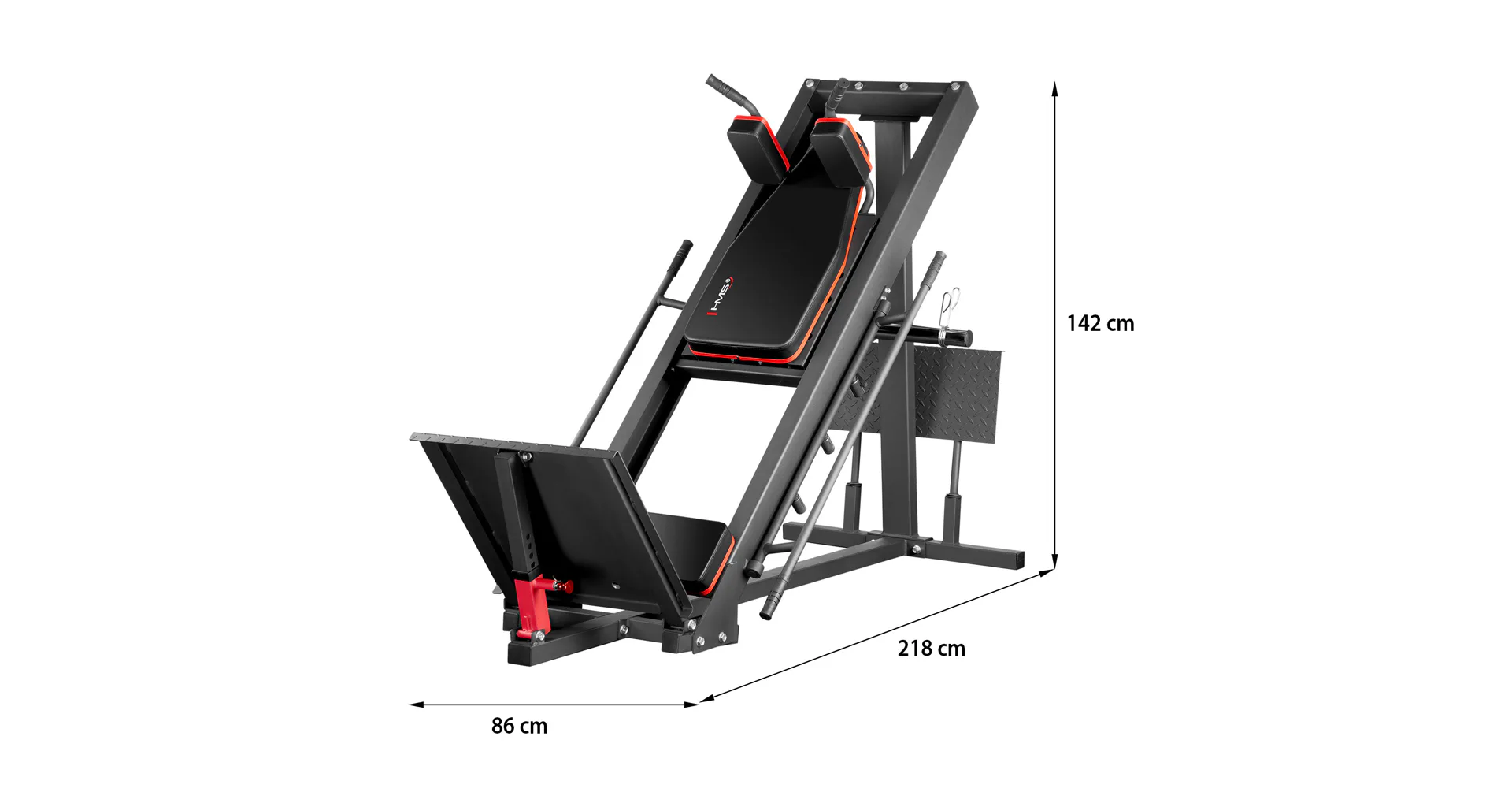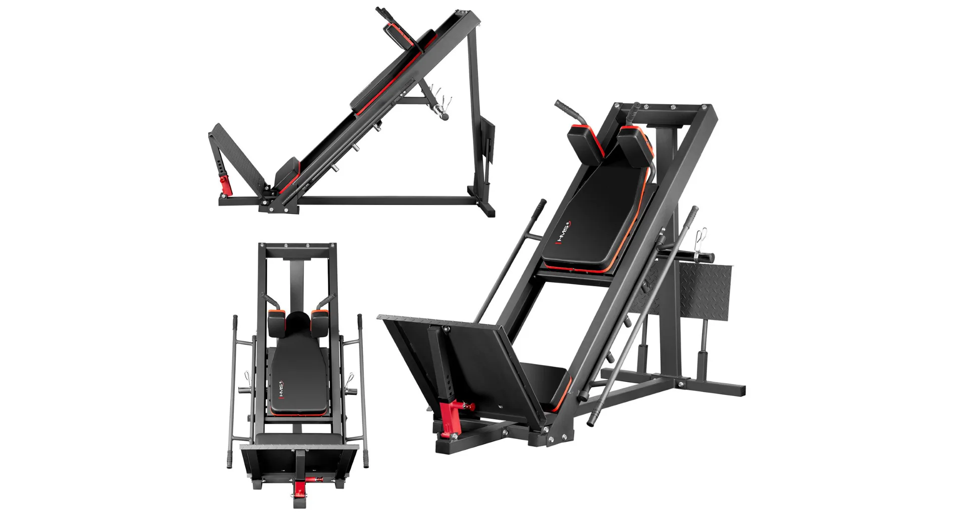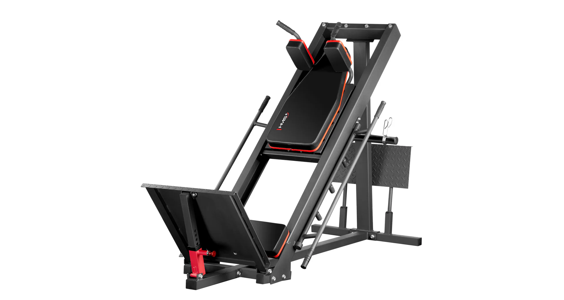 Objevte HMS CM20 - posilovací stroj na nohy 2v1, který je určen pro ty, kteří chtějí zintenzivnit trénink nohou, aniž by se vzdali bezpečnosti a pohodlí. Stroj lze sestavit jako leg-press, nebo hacken dřep a umožňuje tak provádět jak dřepy, tak tlaky, takže se stane vaším partnerem na cestě k dosažení vyšších tréninkových cílů.