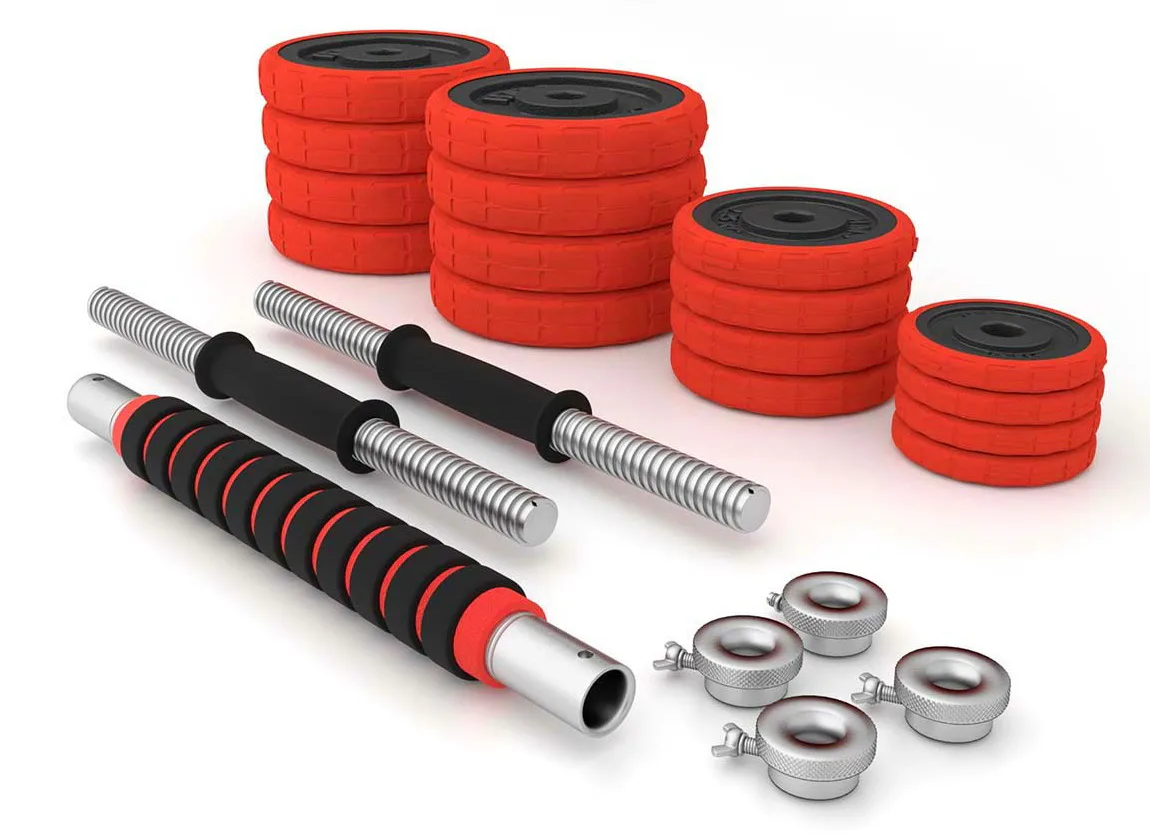 Činky jsou vyrobeny z vysoce kvalitní lité oceli, která je zárukou dlouhé životnosti. Kotouče jsou opatřeny gumovým návlekem, který chrání jak činky, pak podlahu před poškozením při neopatrném odložení. Proti posunutí závaží se činky zajišťují šroubovacími zámky, které jsou dodatečně jištěny šroubem.