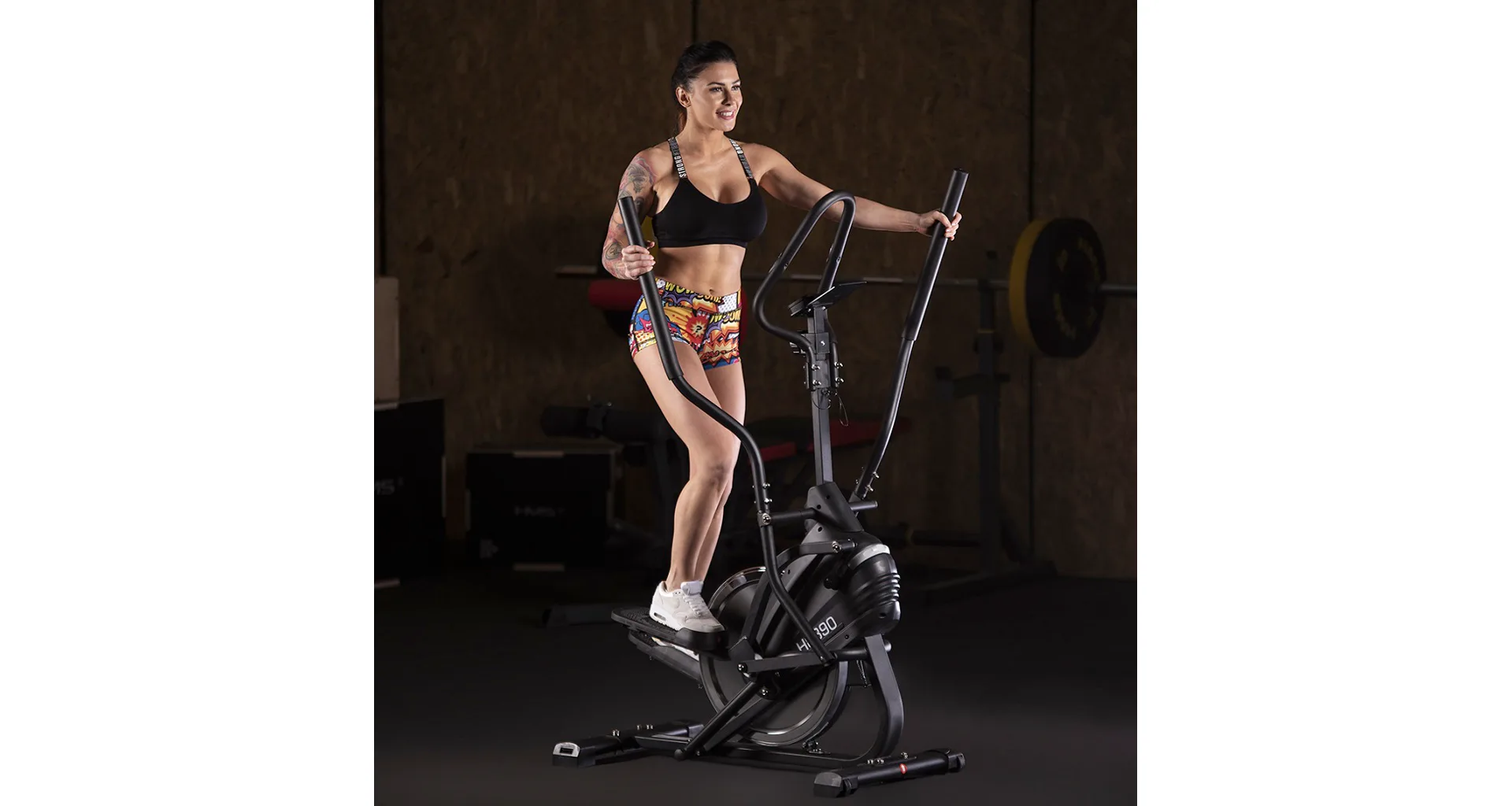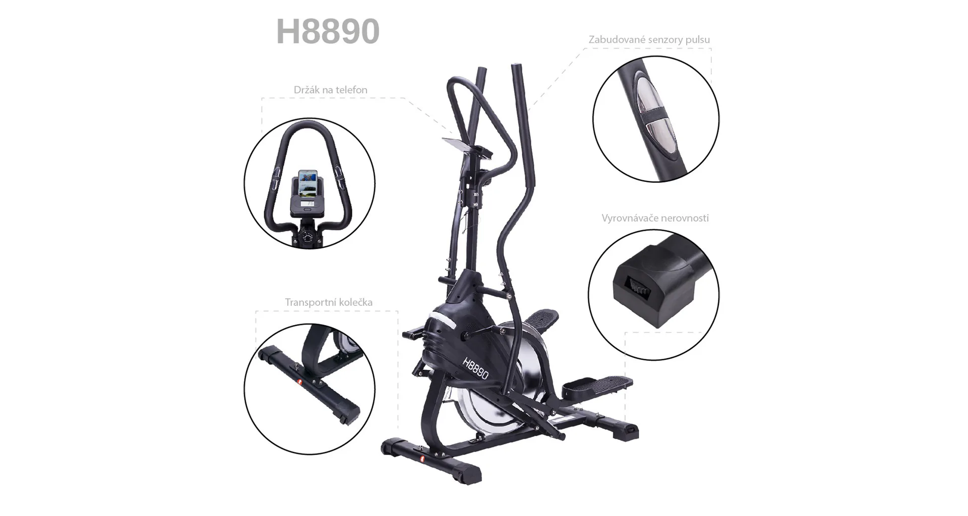 Tento magnetický trenažér HMS H8890 je v podstatě kombinace eliptického trenažérem, spinbiku a stepperu s velkým setrvačníkem a pohybem pedálů po kružnici. Disponuje velkým 8-mi kilogramovým zátěžovým kolem a zaručuje rychlost a plynulost pohybu jako na spinbiku. Šikmé vodící kolejnice zajišťují pohyb pedálů po kružnici, tento pohyb je kratší než u klasického elipticalu a šikmější, než u stepperu. Díky pohyblivým madlům zapojíte do tréninku i horní polovinu těla.