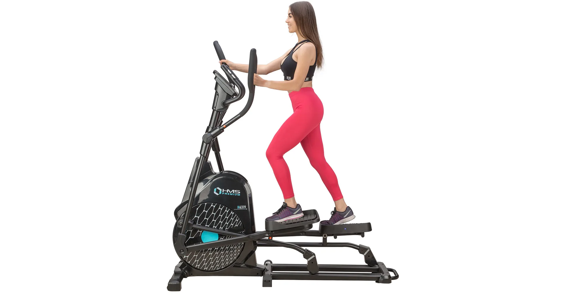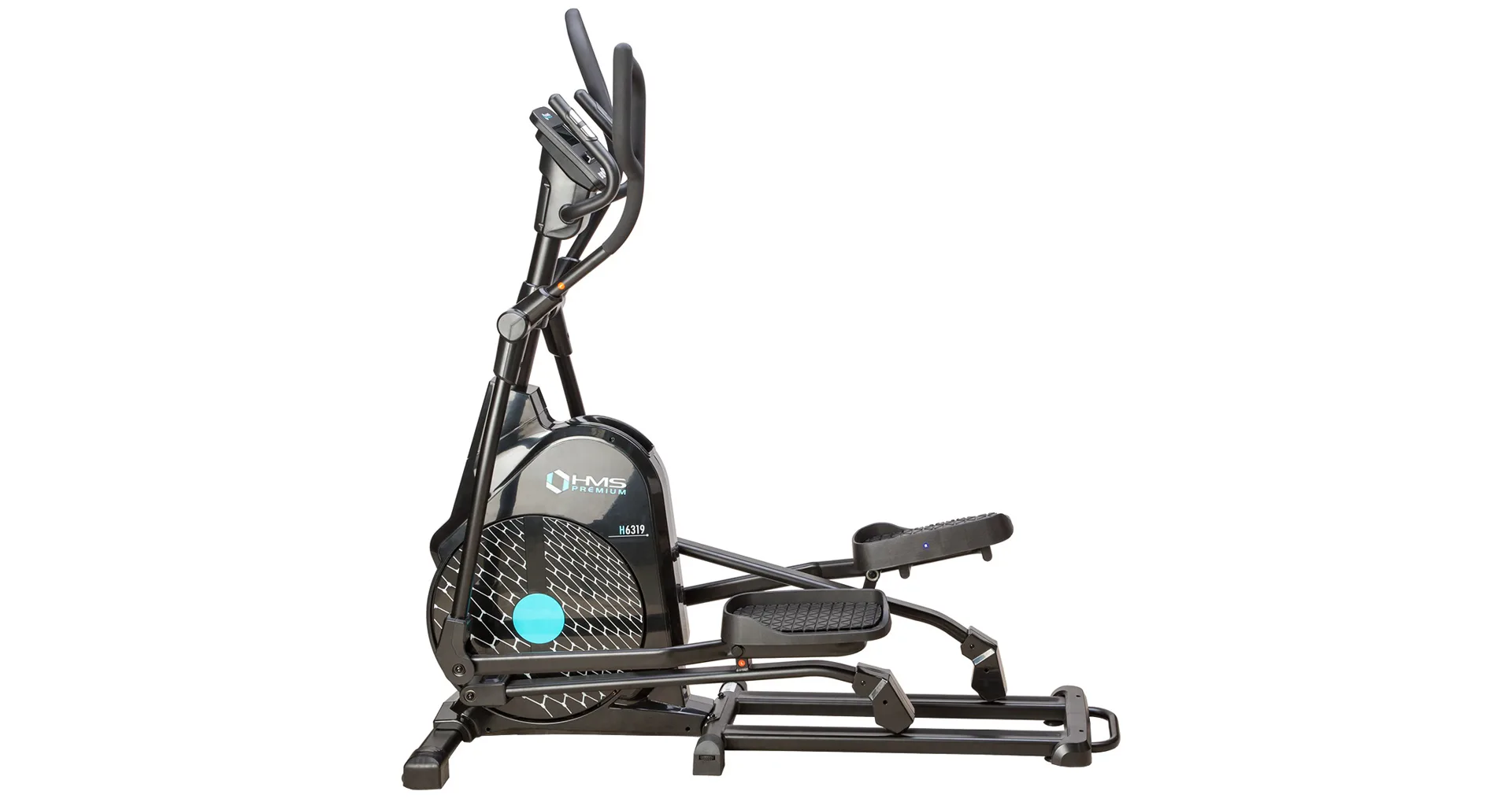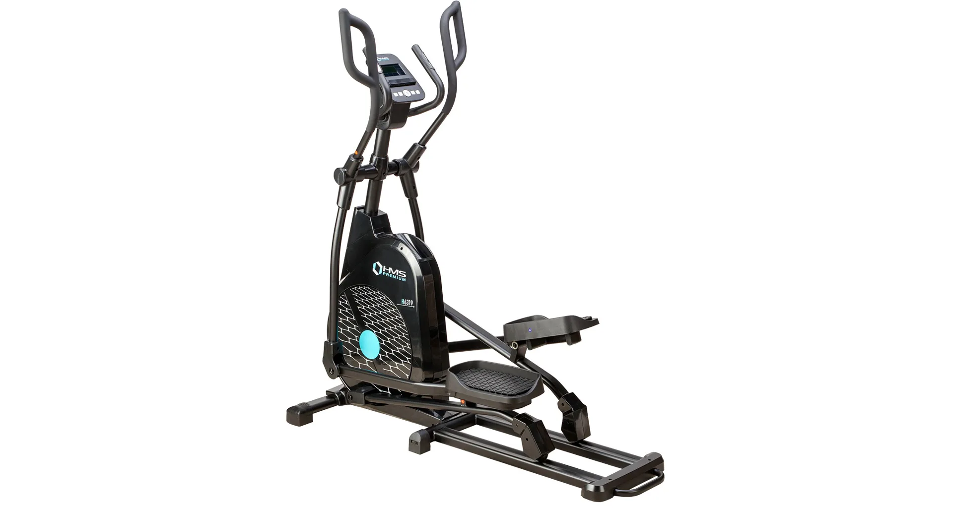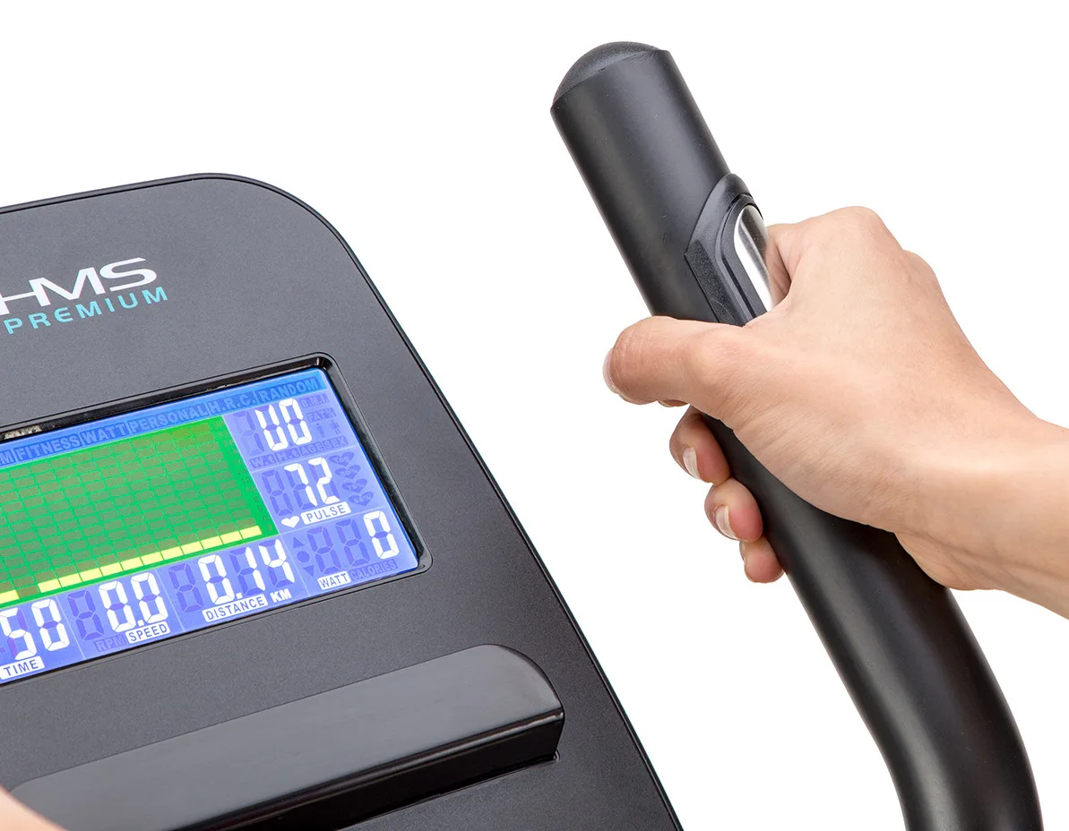 Eliptický trenažér HMS Premium H6319 je určen pro intenzivní trénink v domácích podmínkách. Největší předností modelu je stabilní konstrukce a 7kilogramové zátěžové kolo v kombinaci s tichou magnetickou brzdou. Zátěž modelu H6319 generuje automaticky ovládaná magnetická brzda, která se podle průběhu zvoleného programu vzdaluje, nebo přibližuje k zátěžovému kolu. Systém s magnetickou brzdou je bezúdržbový, tichý a umožňuje přesné přizpůsobení zátěže aktuálním potřebám, nebo požadavkům. Trenažér H6319 je vybaven moderním počítačem s přehledným LCD displejem, který zobrazuje všechny údaje na jednom panelu bez potřeby jejich přepínání. Jednotlivá pole zobrazují počet otáček za minutu, čas tréninku, tepovou frekvenci, vzdálenost, spálené kalorie a rychlost. Na klávesnici se nacházejí 4 tlačítka funkcí a otočný přepínač s potvrzovacím středem.Technické parametry: