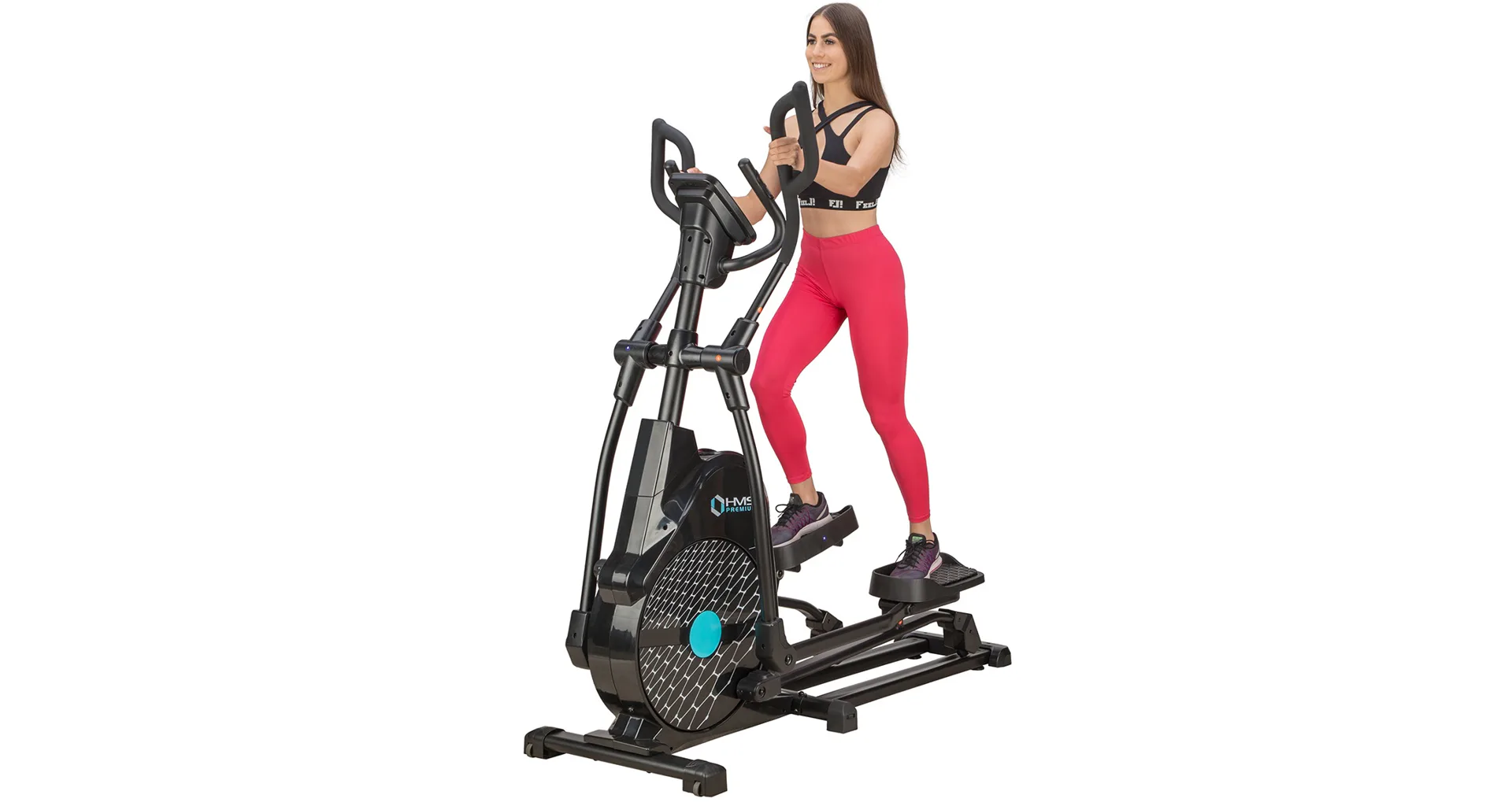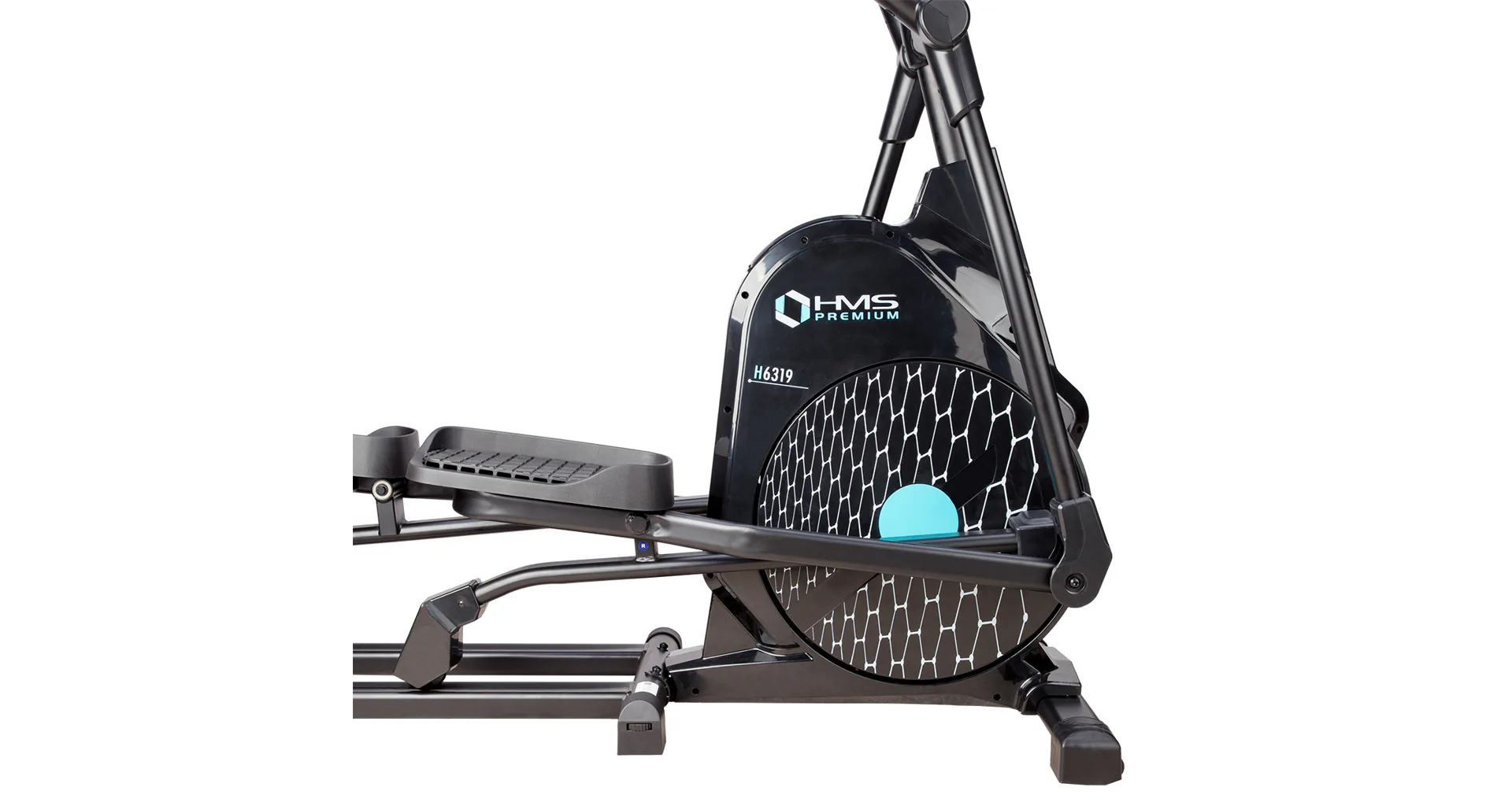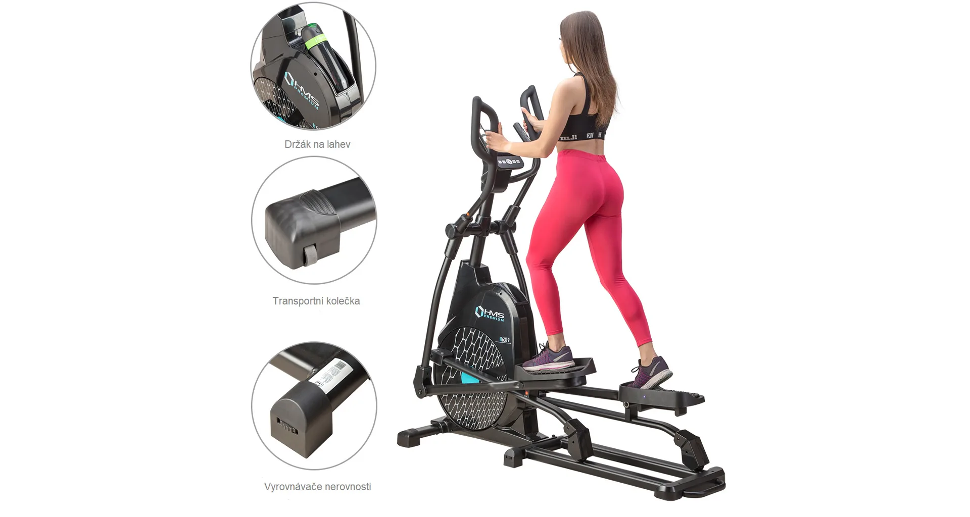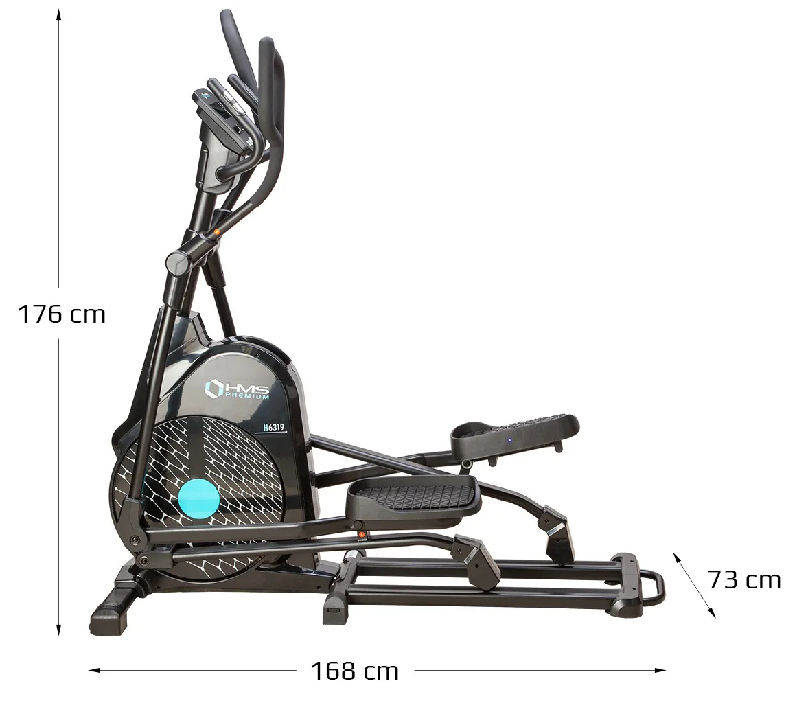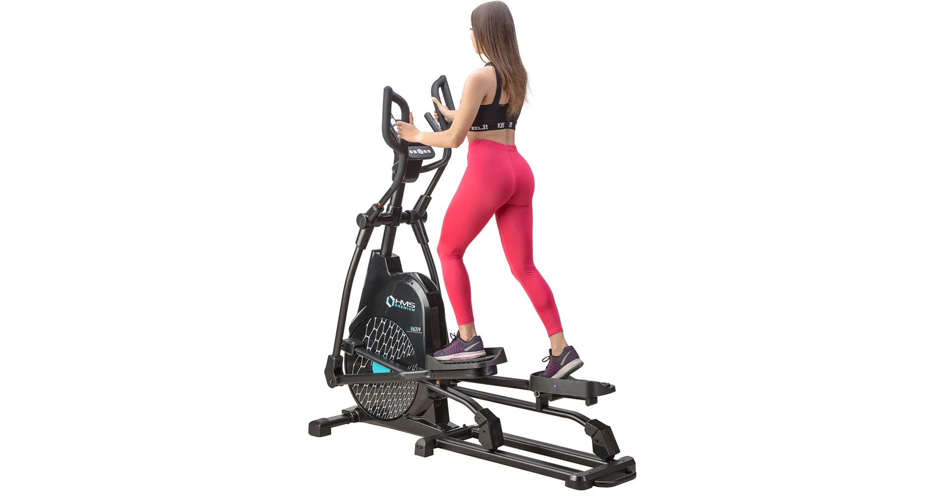 Eliptický trenažér HMS Premium H6319 je určen pro intenzivní trénink v domácích podmínkách. Největší předností modelu je stabilní konstrukce a 7kilogramové zátěžové kolo v kombinaci s tichou magnetickou brzdou. Zátěž modelu H6319 generuje automaticky ovládaná magnetická brzda, která se podle průběhu zvoleného programu vzdaluje, nebo přibližuje k zátěžovému kolu. Systém s magnetickou brzdou je bezúdržbový, tichý a umožňuje přesné přizpůsobení zátěže aktuálním potřebám, nebo požadavkům. Trenažér H6319 je vybaven moderním počítačem s přehledným LCD displejem, který zobrazuje všechny údaje na jednom panelu bez potřeby jejich přepínání. Jednotlivá pole zobrazují počet otáček za minutu, čas tréninku, tepovou frekvenci, vzdálenost, spálené kalorie a rychlost. Na klávesnici se nacházejí 4 tlačítka funkcí a otočný přepínač s potvrzovacím středem.Technické parametry: