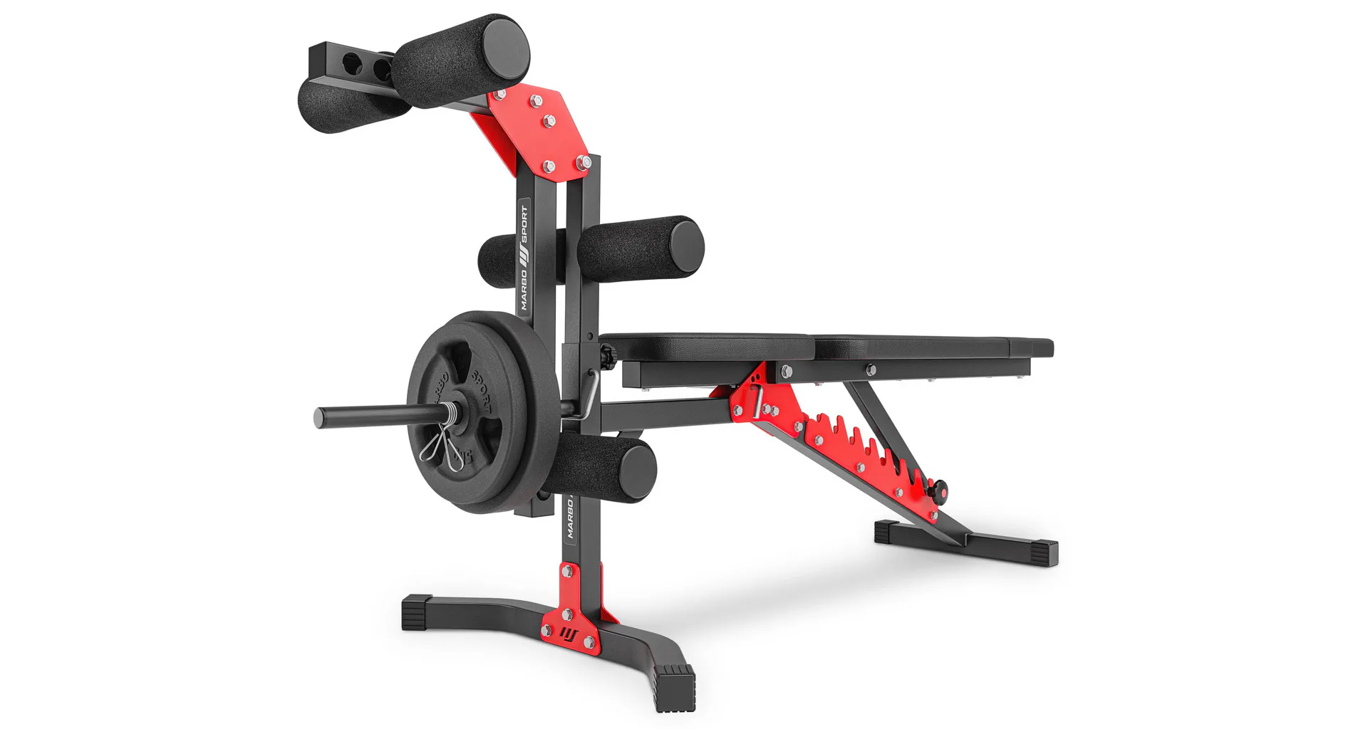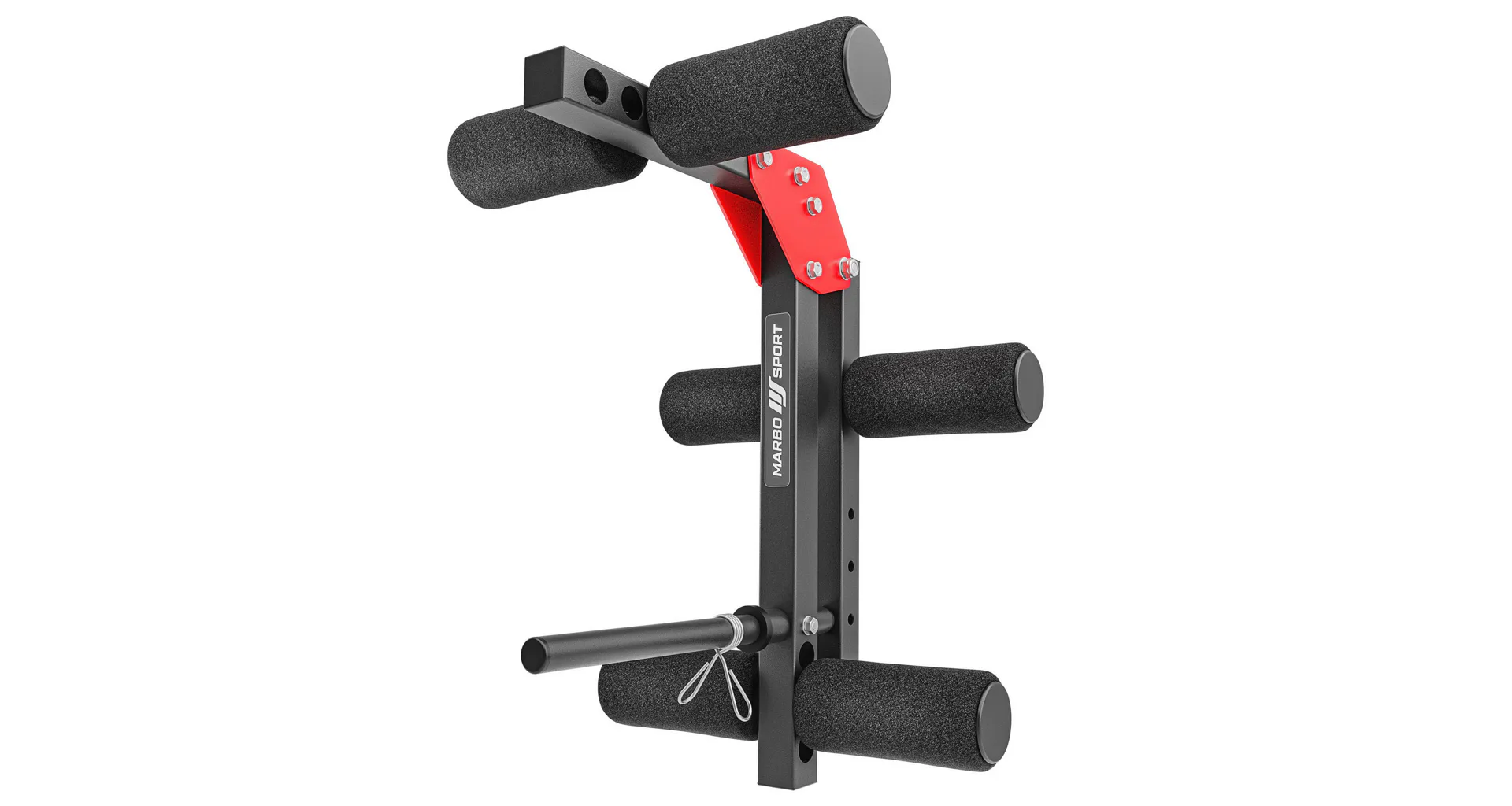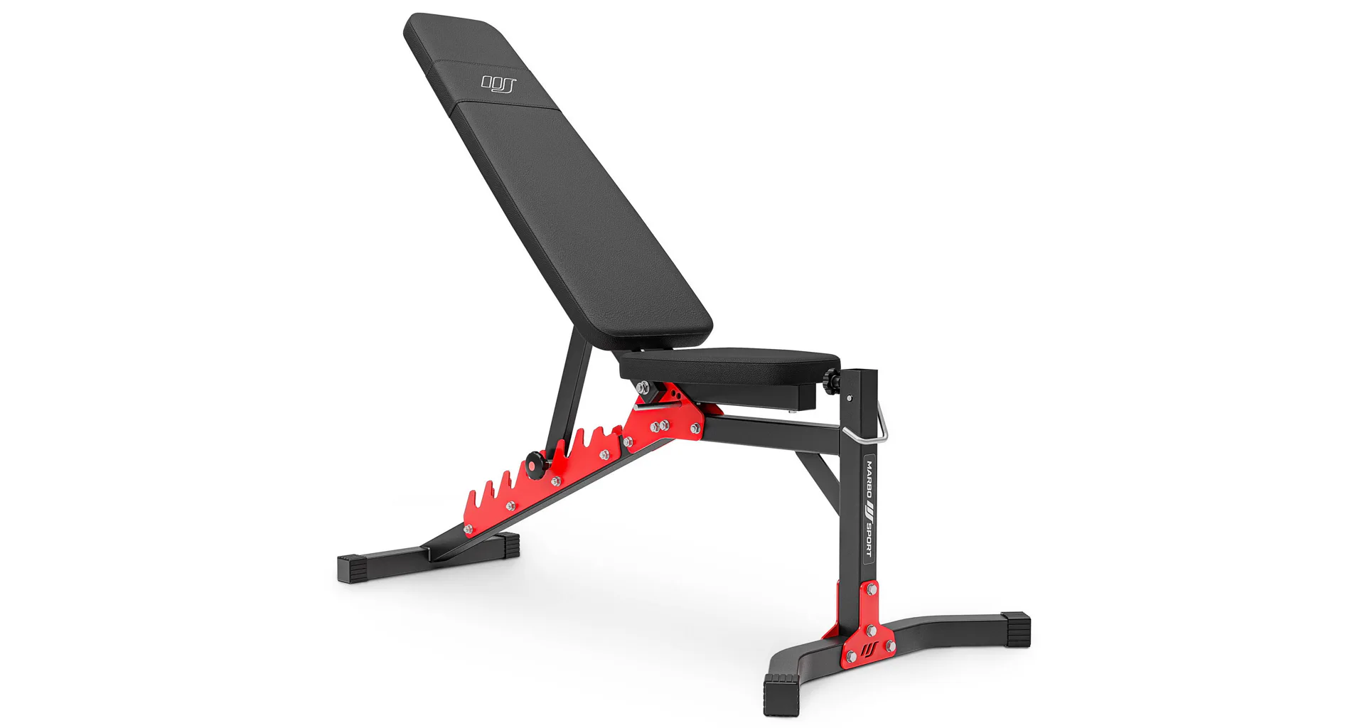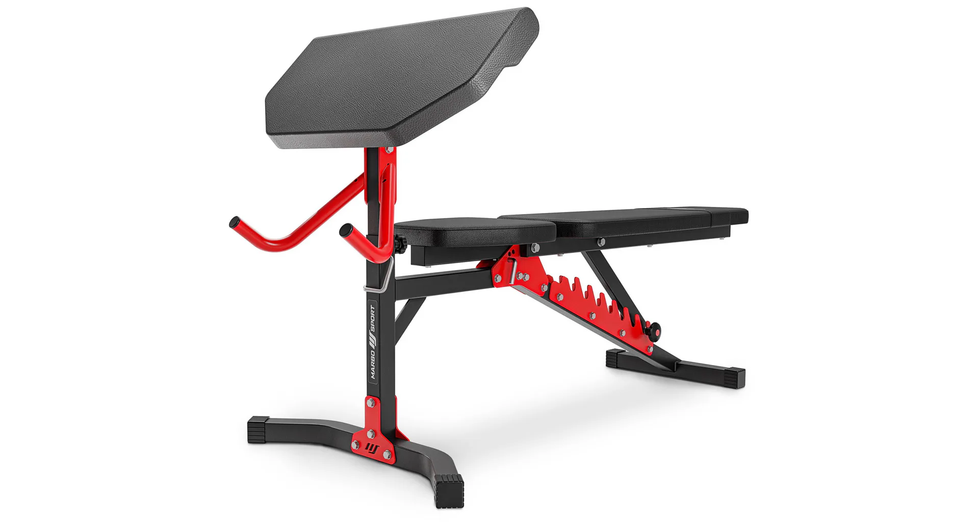 Praktickou stránkou lavice MARBO MH-KBH-115 je regulace zádové opěry, která se provádí pomocí šroubů s plastovým, ergonomickým úchytem. Polstrování jsme opatřily dvojitými švy pro maximální pevnost. V nejnamáhanějším místě jsme opěrku přetáhli druhou vrstvou kůže s logem MARBO Sport. Lavice MARBO MH-KBH-115 je vybavena bicepsovou opěrkou a také kopačem pro cvičení předkopávání a zakopávání.