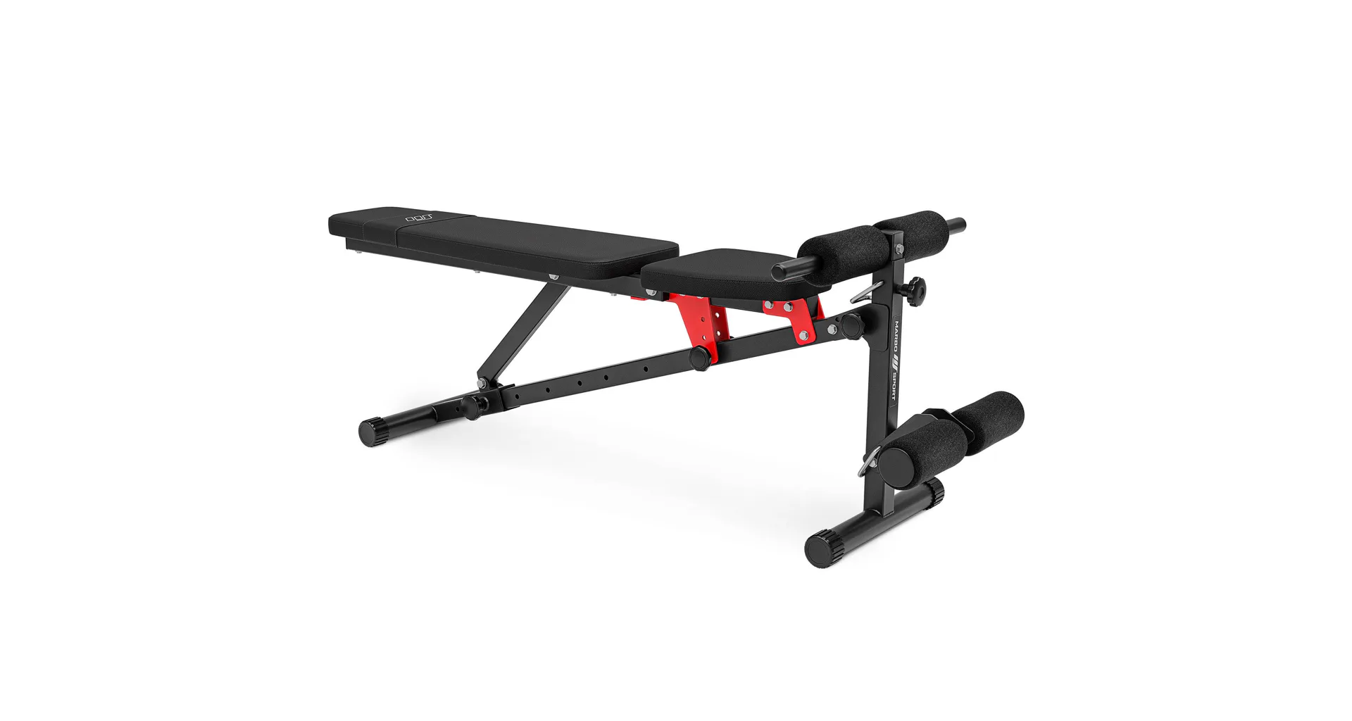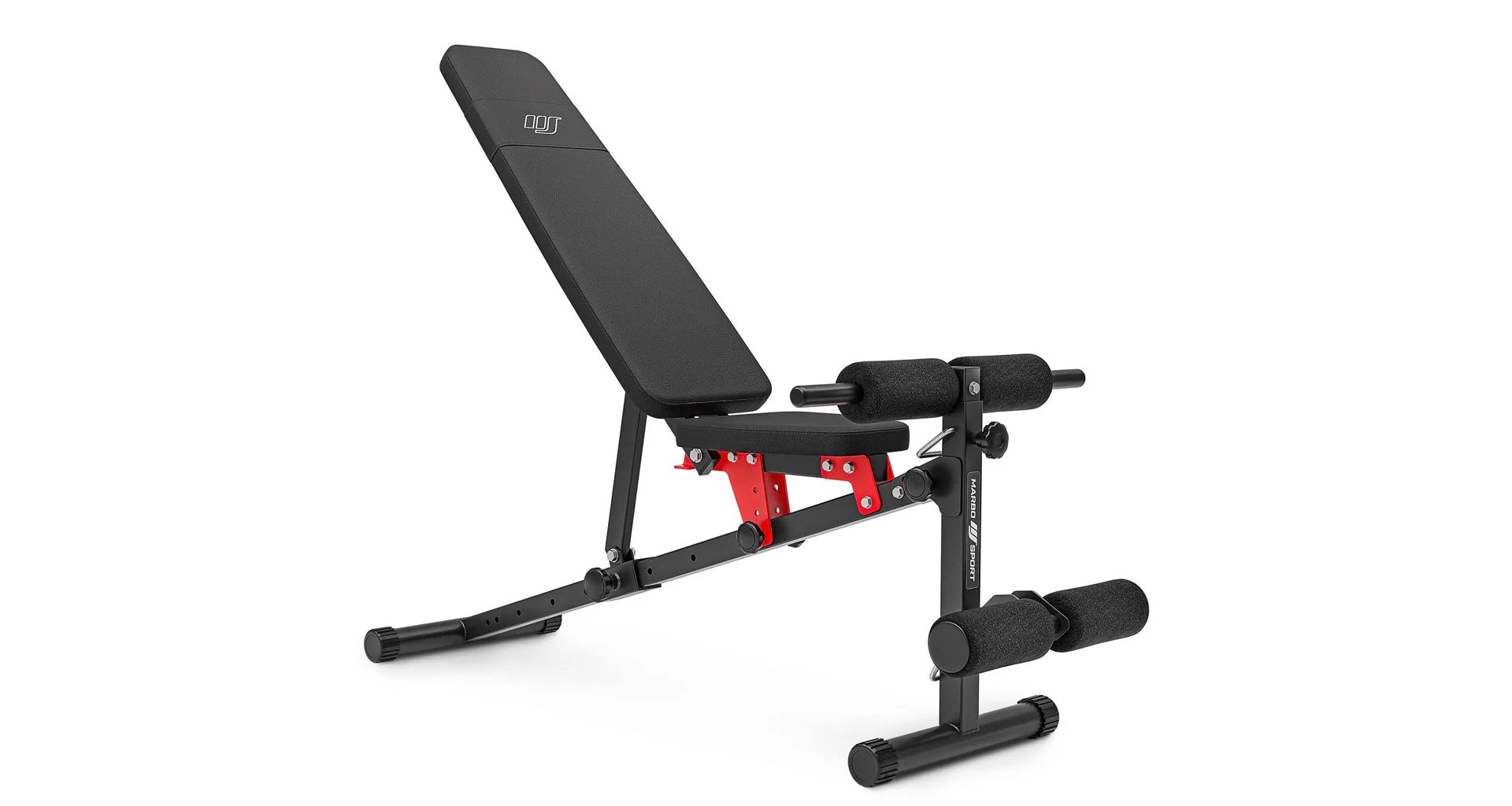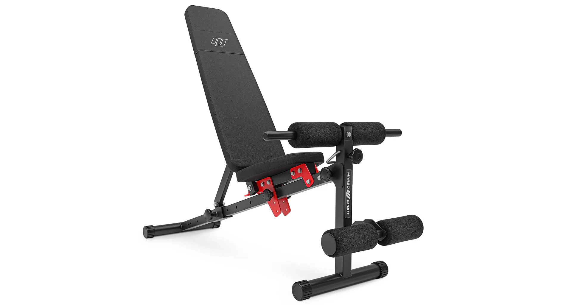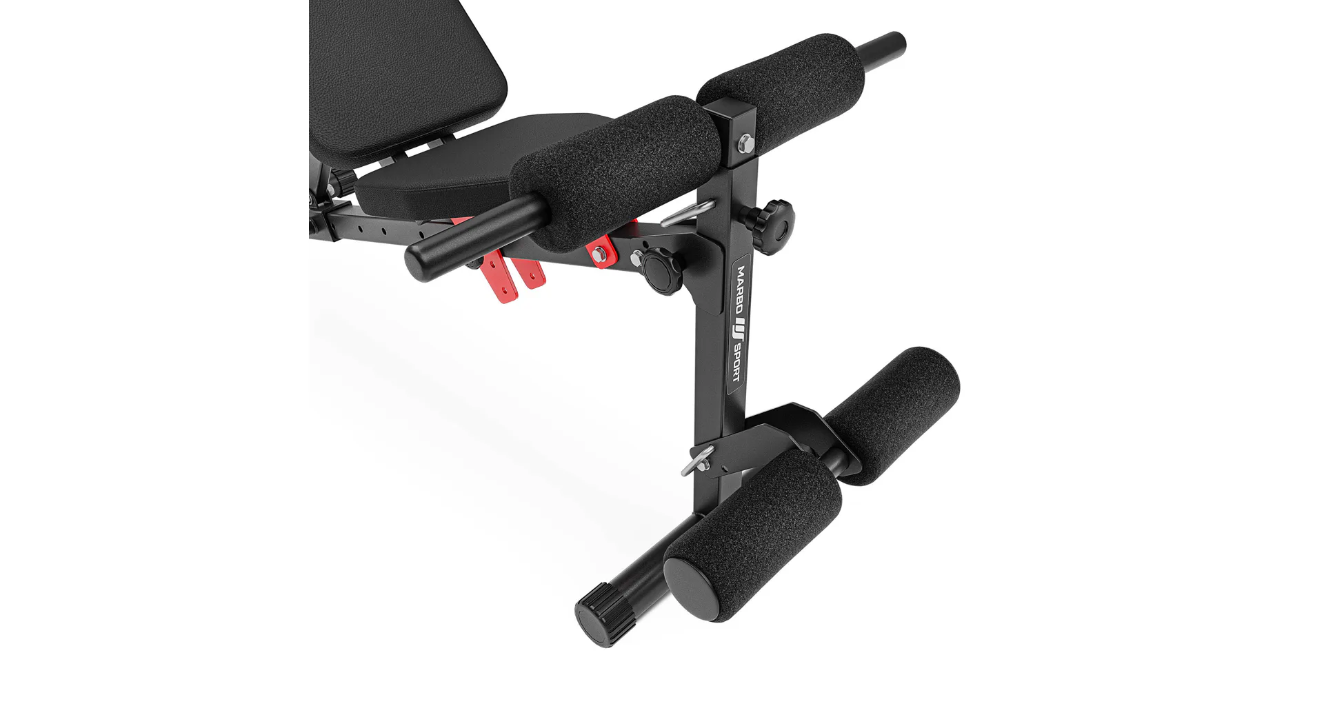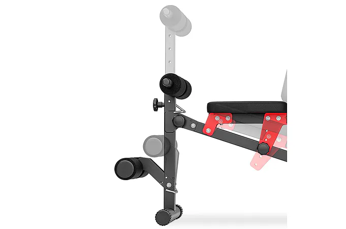 Praktickou stránkou lavice MARBO MH-L111 2.0 je regulace zádové opěry, která se provádí pomocí šroubů s plastovým, ergonomickým úchytem. Polstrování je opatřeno dvojitými švy pro maximální pevnost. V nejnamáhanějším místě jsme opěrku přetáhli druhou vrstvou kůže s logem MARBO Sport.
