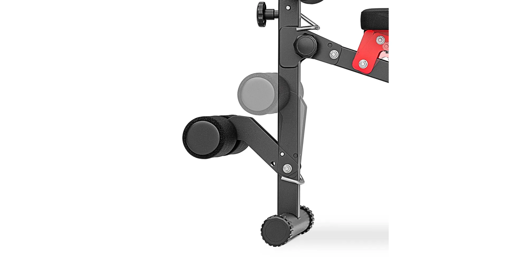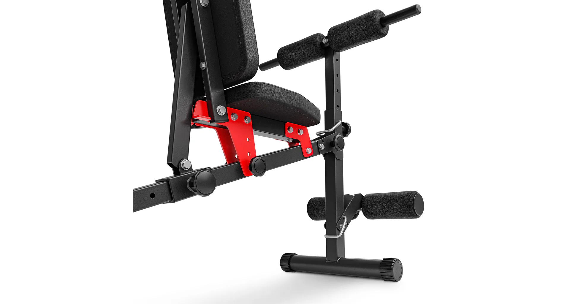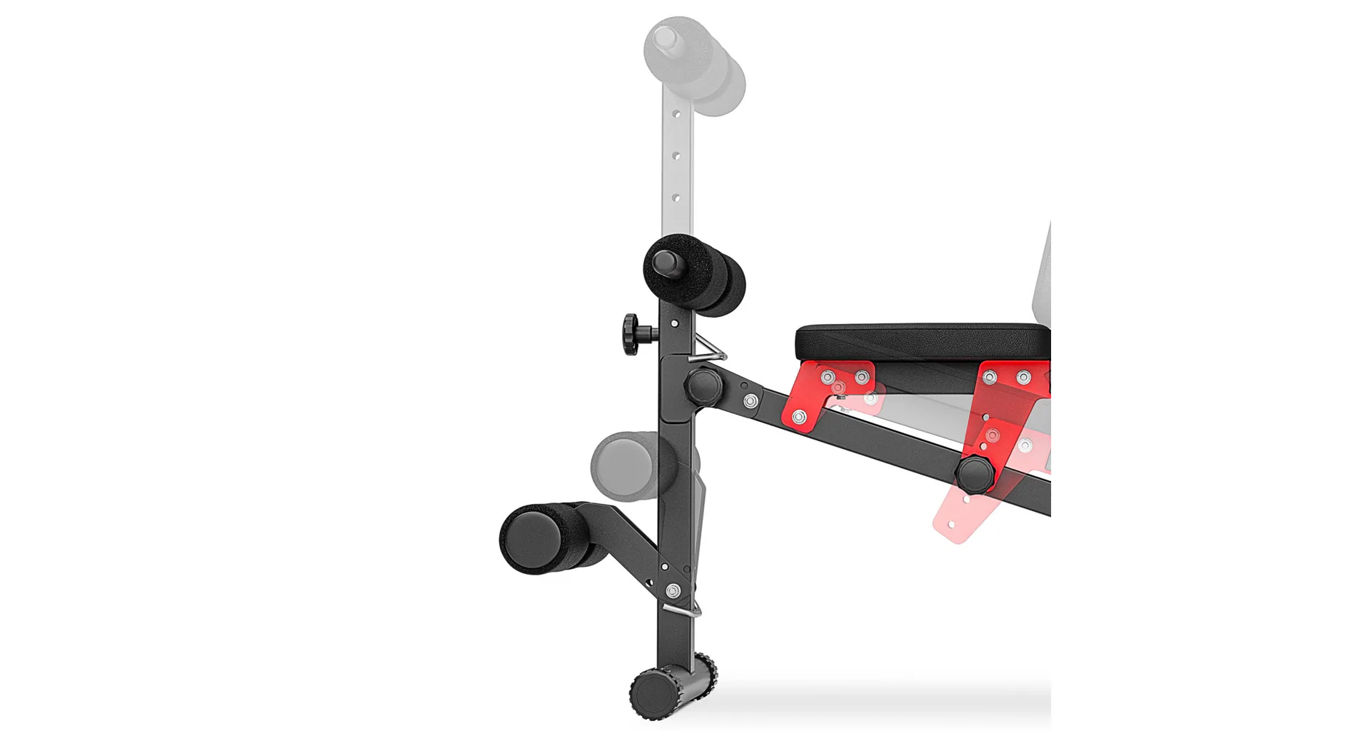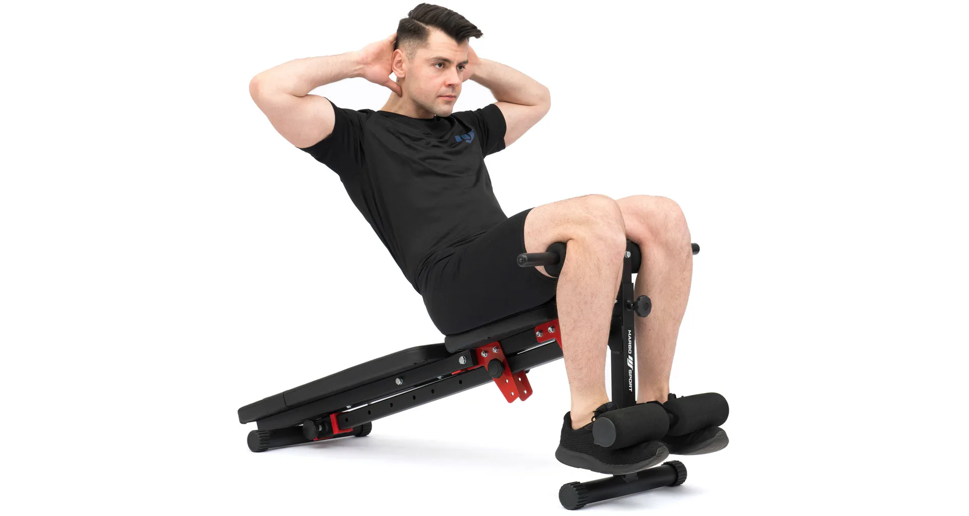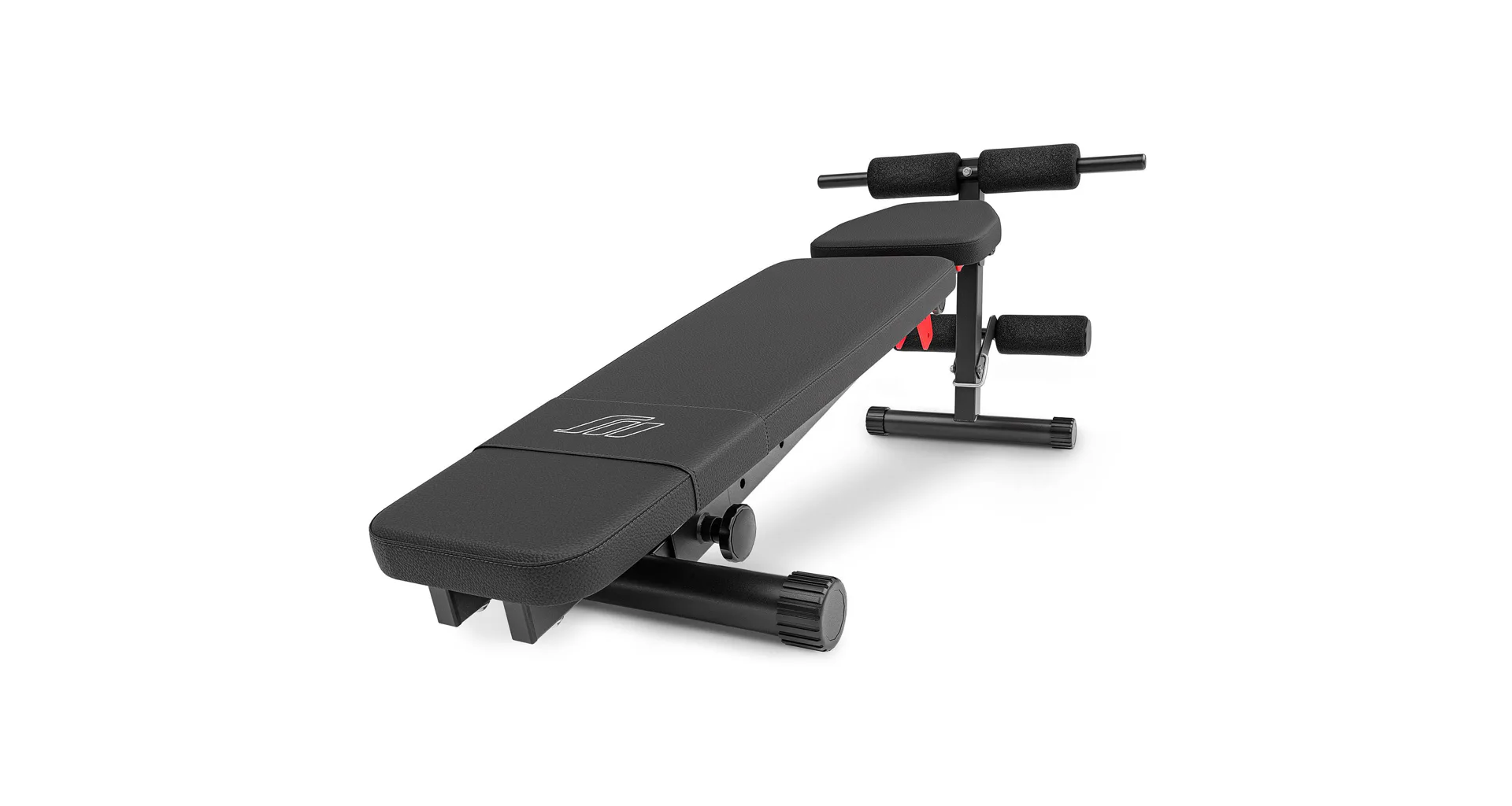 Praktickou stránkou lavice MARBO MH-L111 2.0 je regulace zádové opěry, která se provádí pomocí šroubů s plastovým, ergonomickým úchytem. Polstrování je opatřeno dvojitými švy pro maximální pevnost. V nejnamáhanějším místě jsme opěrku přetáhli druhou vrstvou kůže s logem MARBO Sport.