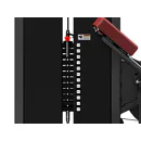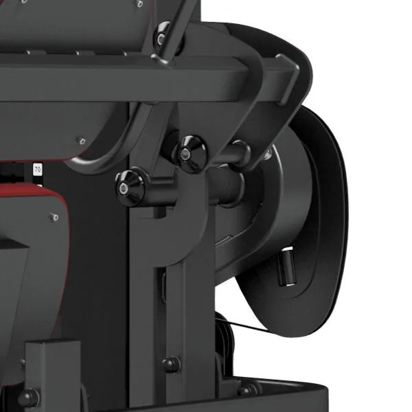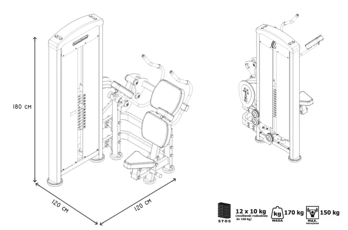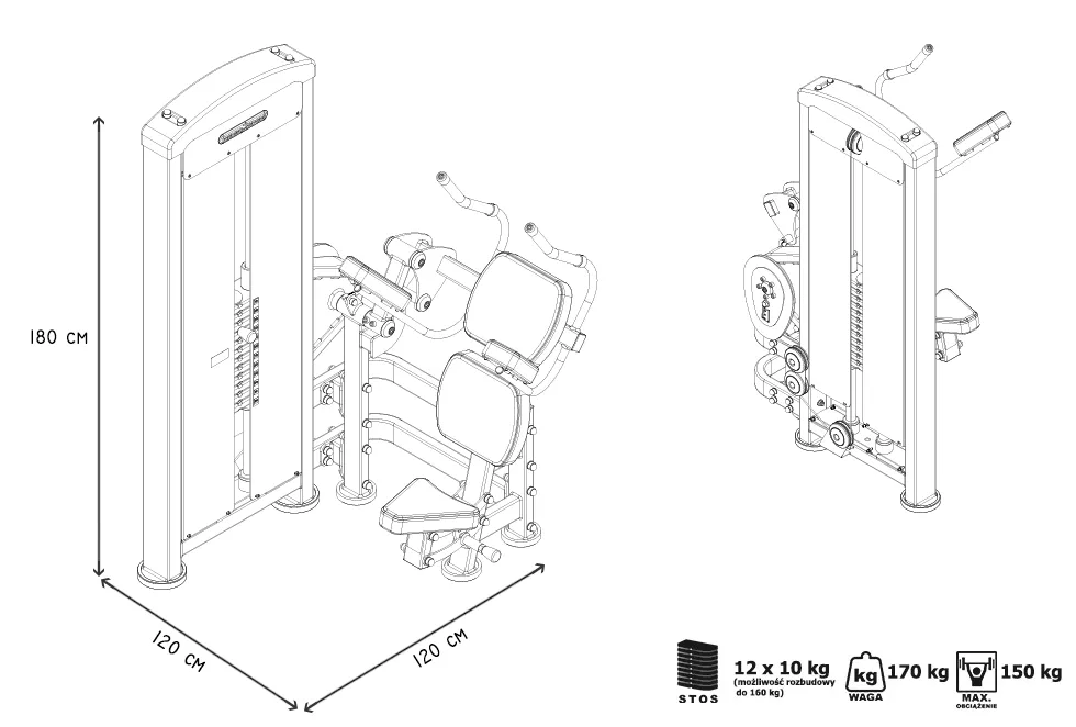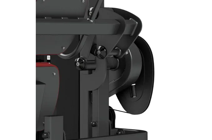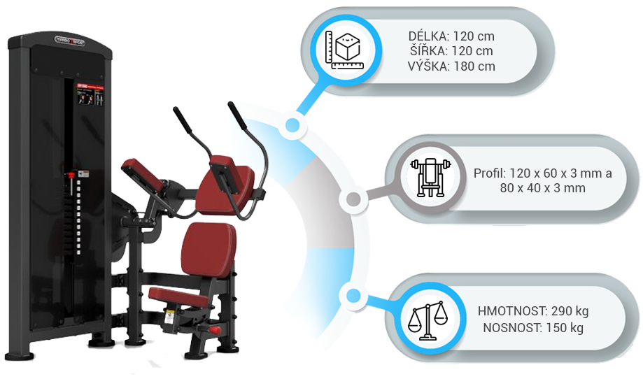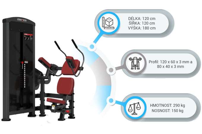 Zátěž tvoří 12ks 10kg cihel. Celková váha závaží dodávána se strojem je tedy 120kg a je možné ji rozšířit až na 160kg. Regulace výšky sedadla je nastavitelná ve čtyřech úrovních za použití červeného, pneumatického jistícího kolíku. Napínaní lanek se provádí regulací 4 šroubů na hlavním vodícím kole. Odpadá tak složité rozebírání stroje. Polstrovaní je ze syntetické kůže sešité režnou nití značky COATS vyplněné tvrdou pěnou, to celé je na 3mm hrubé, ocelové desce.