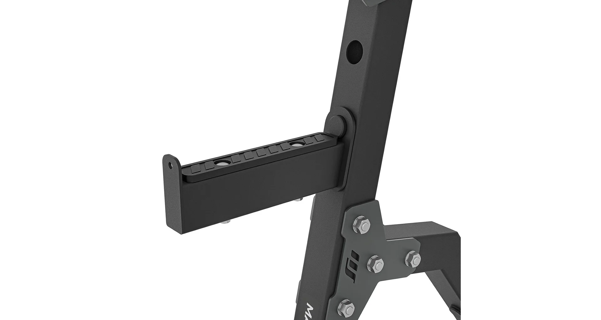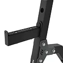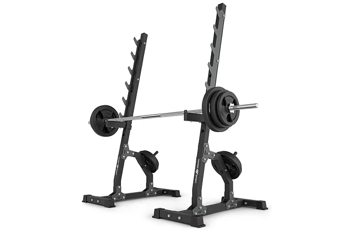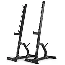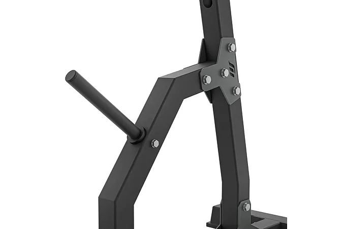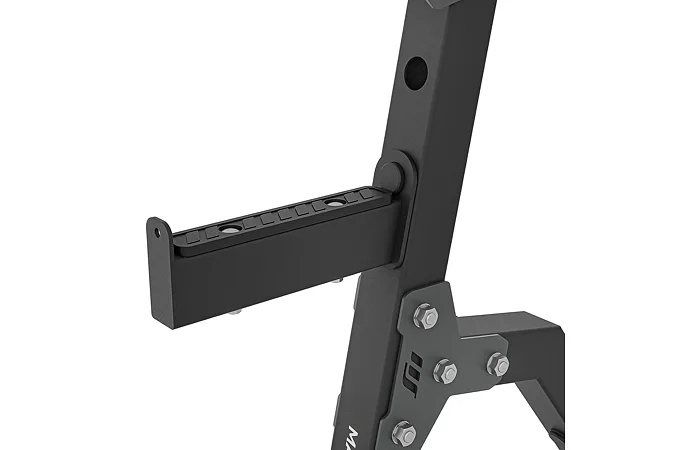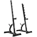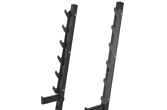 Háky na činku jsou tvarovány pro bezpečné odložení během i po dokončení série. Možnost nastavení výšky startovní pozice usnadňuje přizpůsobení různým cvikům a úrovním pokročilosti. Bezpečnostní zarážky pomáhají při cvicích na ramena nebo při dřepech a jejich gumová vrstva chrání konstrukci před opotřebením. Praktické trny pro uložení závaží zajišťují pořádek v tréninkovém prostoru.
