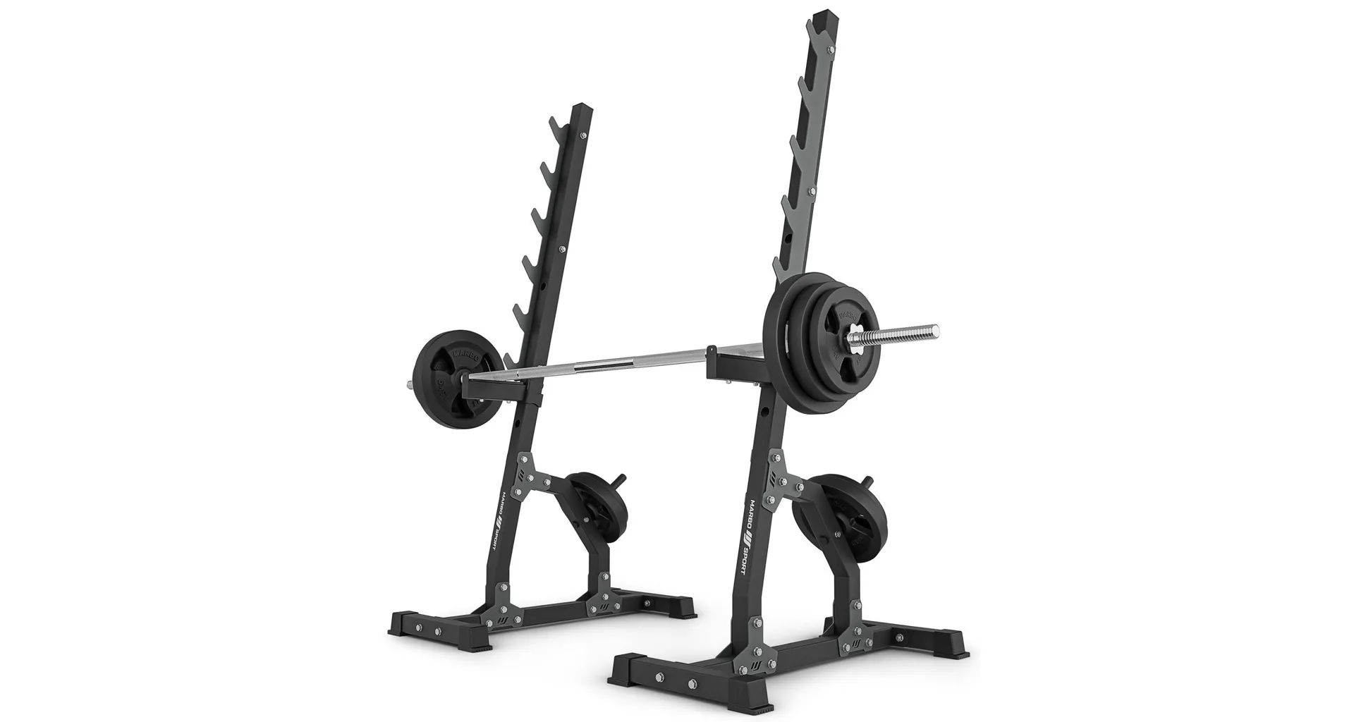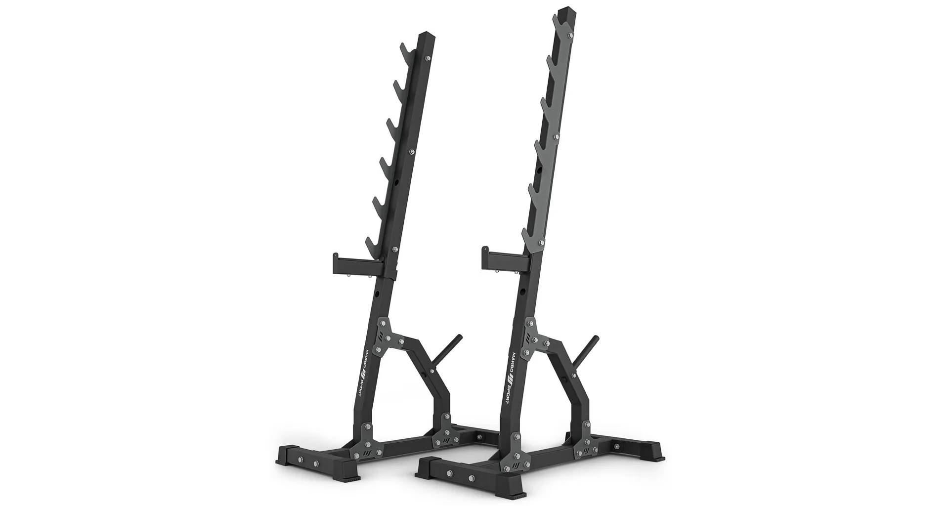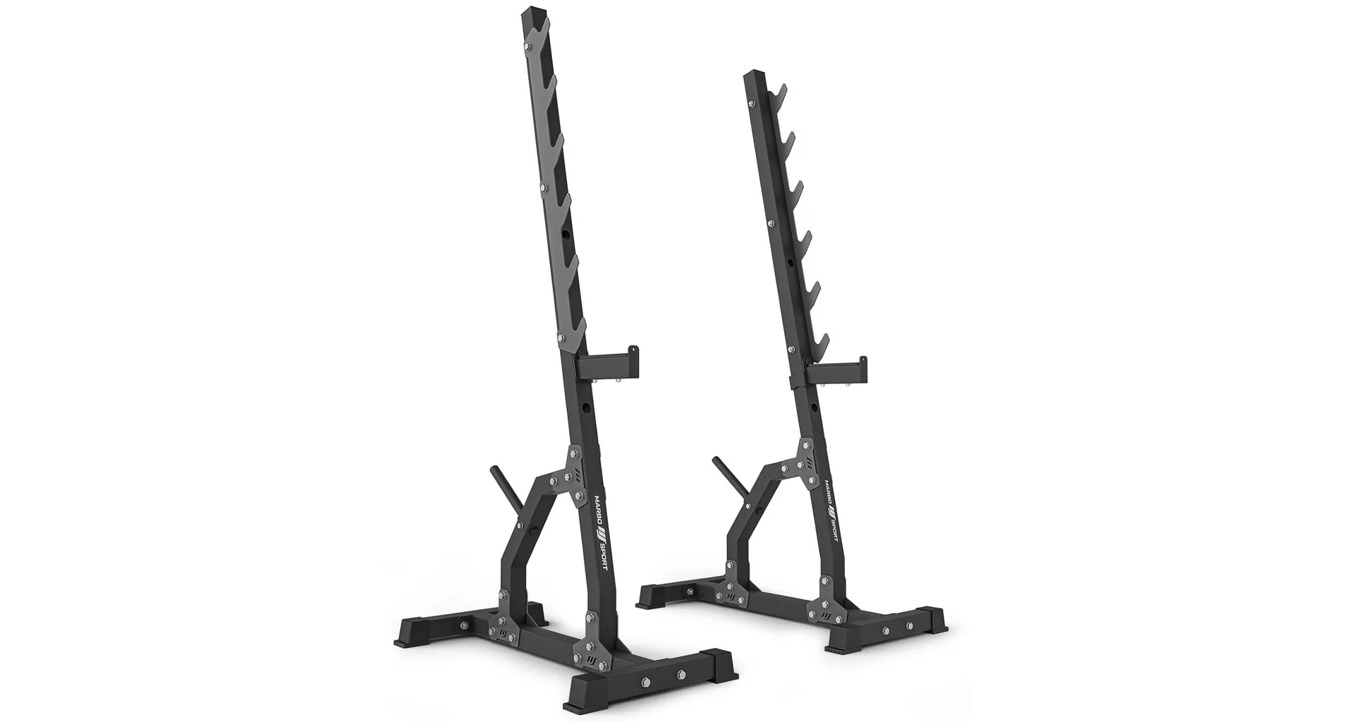 Víceúrovňové stojany MS-S105 2.0 od Marbo Sport jsou stabilní a funkční oporou pro silový trénink s činkou. Díky robustní ocelové konstrukci zvládnou vysoké zatížení a umožní bezpečné provádění různých cviků. Šest párů háků pro odložení činky poskytuje variabilitu při tréninku, zatímco tříúrovňové bezpečnostní zarážky přispívají k maximálnímu pohodlí a ochraně při cvičení.