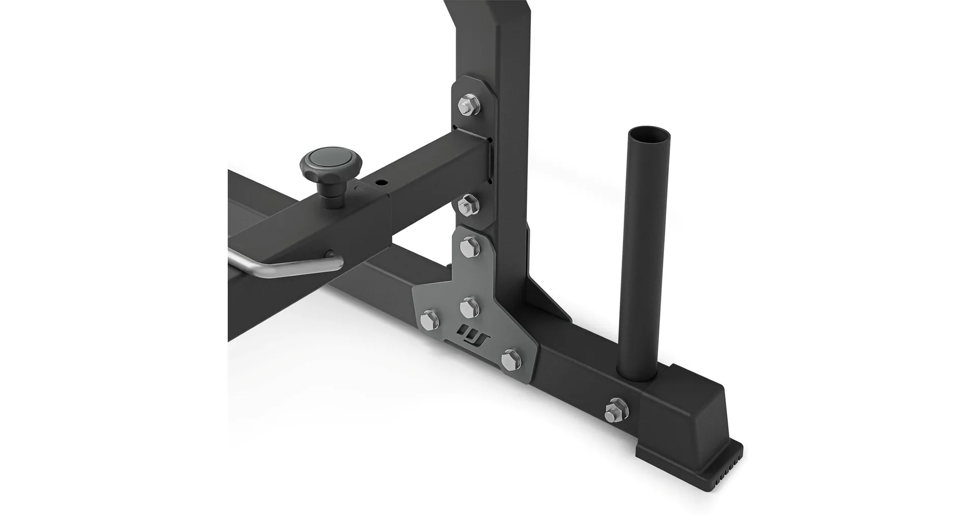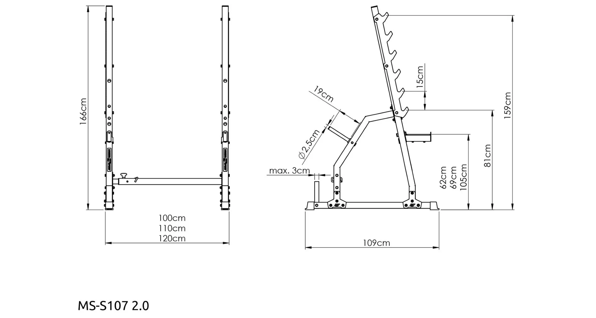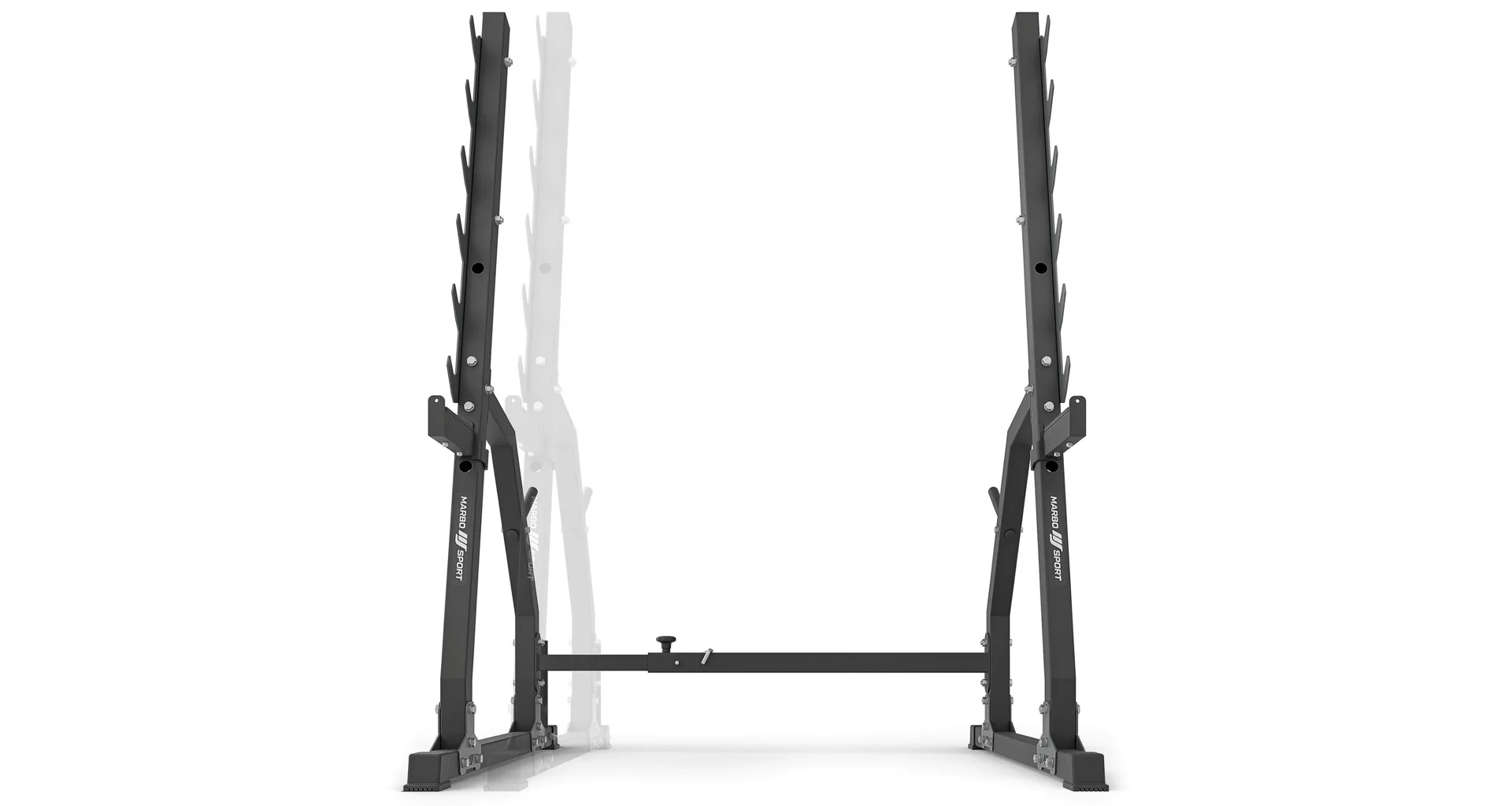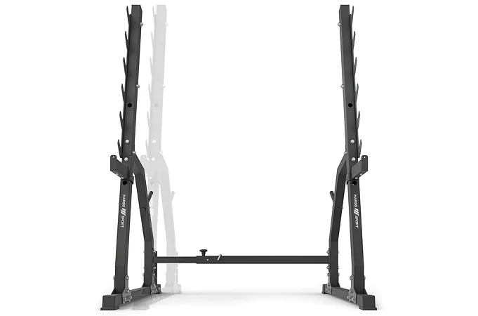 Stojany jsou propojeny příčkou. Rozteč mezi nimi lze snadno a rychle nastavit. K dispozici jsou 3 polohy: 100, 110 a 120 cm. Díky tomu můžete během tréninku používat osy různých délek bez obav o stabilitu jištění. Stojany zůstanou na svém místě a nerozjedou se ani při prudkém odložení závaží.