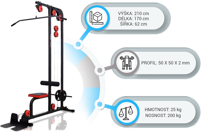 Jedná se o klasickou horní a dolní kladku na přítahy/veslování na zádové svaly, případně na cviky tricepsu, bicepsu, ramen, břišních svalů apod., MARBO MS-W101 má konstrukci s nosností do 140 kg a zajišťuje stabilitu a bezpečnost při tréninku. Má pohodlný polstrovaný sedák, který lze odejmout a nášlapy s protiskluzovým povrchem.