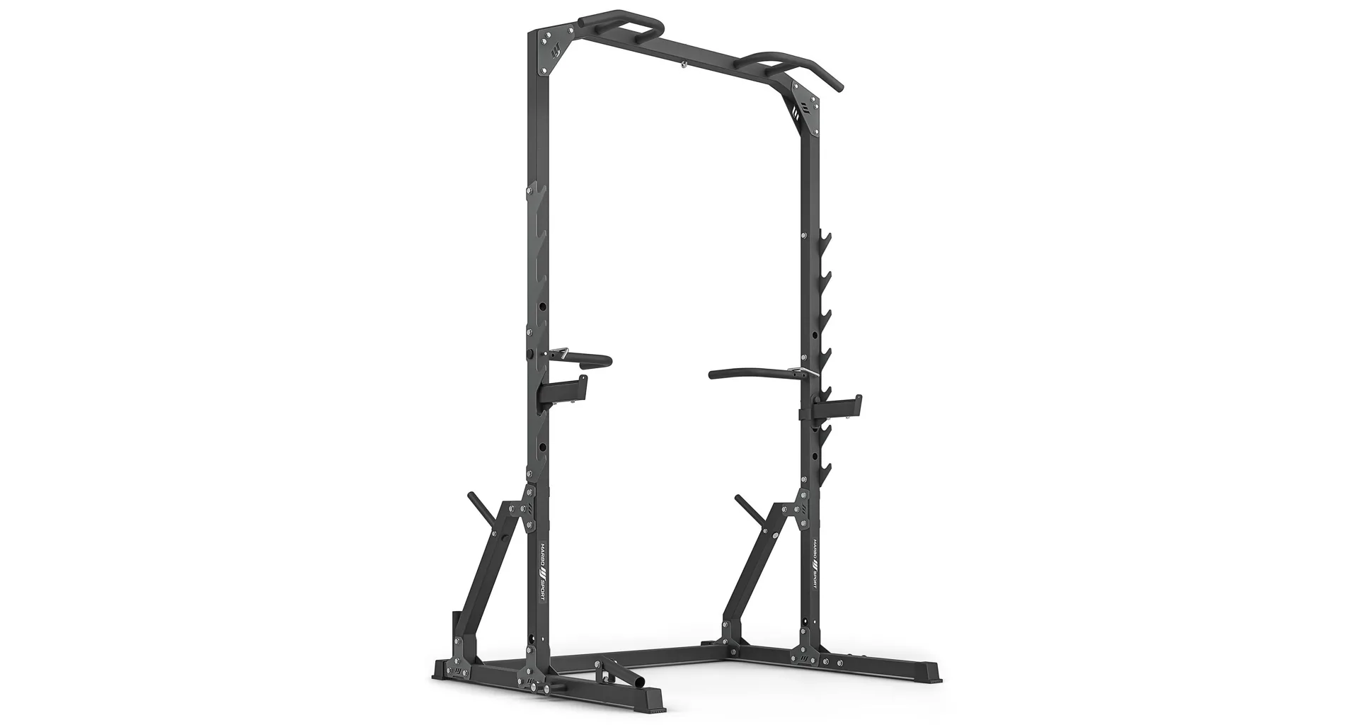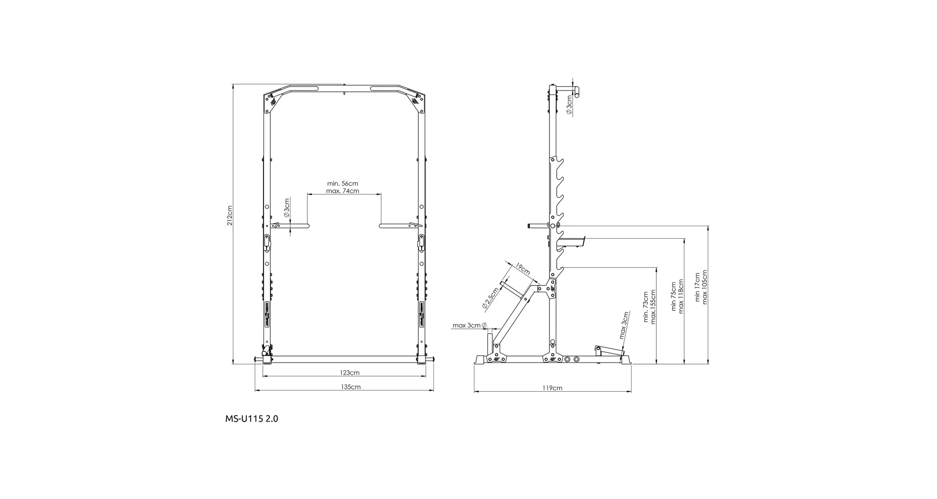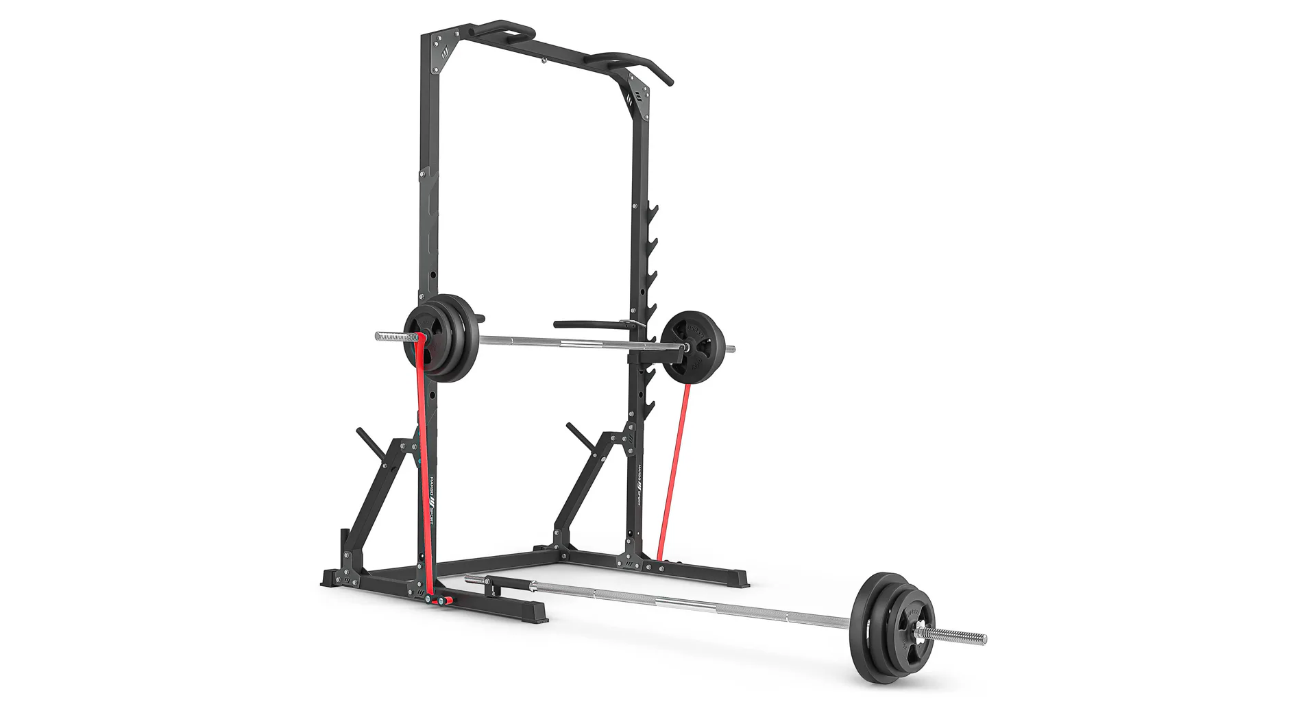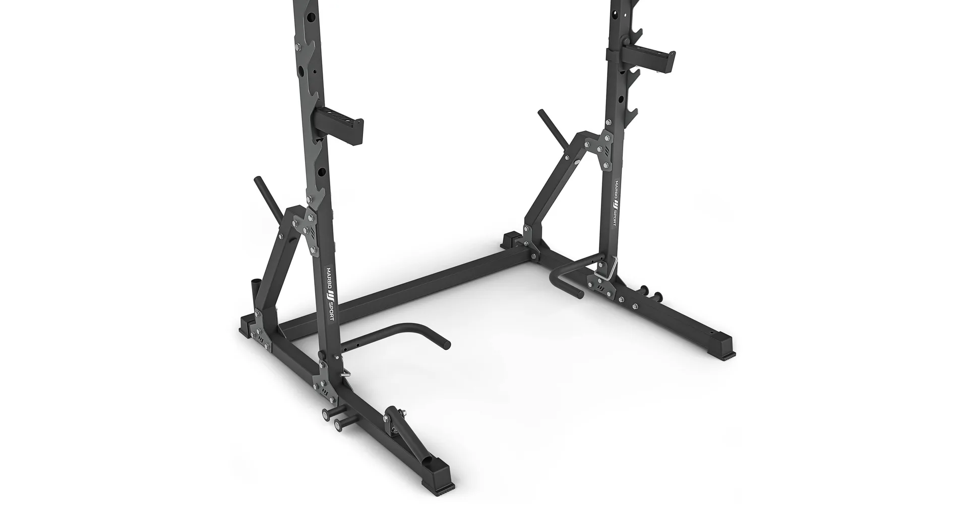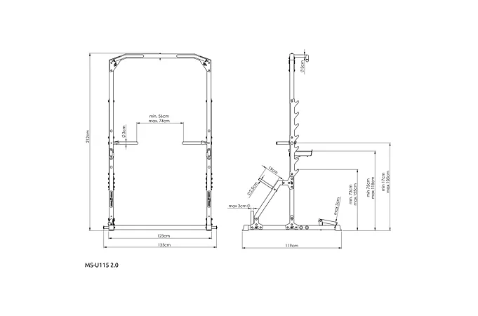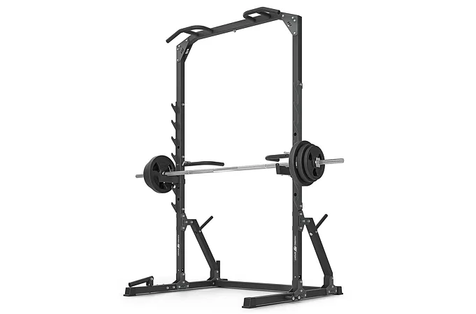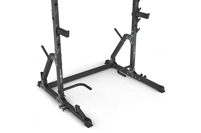 Po stranách rámu se nachází 7 párů háků pro odkládání vzpěračské osy. Háky mají rozsah výšky od 73 do 155 cm a vzdálenost mezi nimi je 123 cm. Hákům asistují bezpečnostní vzpěry, které mají čep, který se zasune do otvoru v požadované výšce a následně se vzpěra otočí, tím dojde k jejímu zajištění. Díky gravitaci zůstane vzpěra pevně na svém místě, takže se nemusíte bát o bezpečnost ani během tréninku s velice těžkou činkou. Vzpěry lze nastavit do 4 poloh v rozsahu výšky od 75-ti do 118-ti cm.