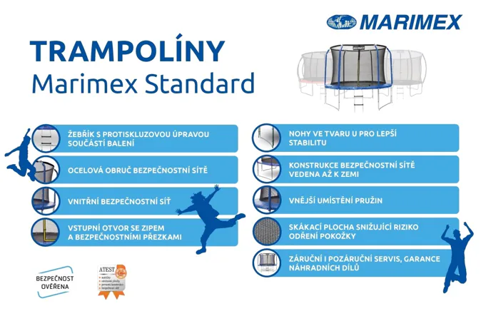 Trampolína Marimex je skvělým doplňkem každé zahrady a vaše děti si skákání na této trampolíně rychle zamilují. Dokonalou stabilitu zajišťují tři nohy ve tvaru písmene U. Nosnost je do 50 kg.