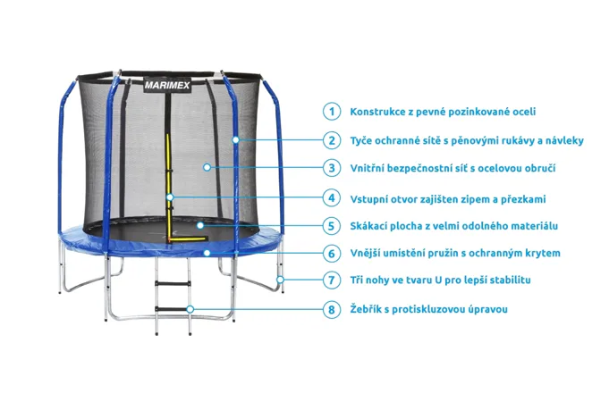 Trampolína Marimex je skvělým doplňkem každé zahrady a vaše děti si skákání na této trmapolíně rychle zamilují. Dokonalou stabilitu zajišťují tři nohy ve tvaru písmene U. Nosnost je až 150 kg, takže si snadno zacvičí i dospělí.