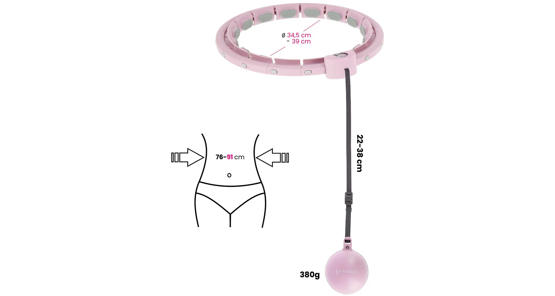 Pravidelné používání HMS HHW09 dokáže zeštíhlit břicho a pas, kroucení boky redukuje tukové tkáně stehen a hýždí. 30 minut tréninku dokáže nahradit až hodinu plavání a nebo 3 hodiny běhu.Jednotlivé díly obruče jsou vyrobeny z kvalitního PVC, závaží je potaženo gumou a naplněno pískem.
