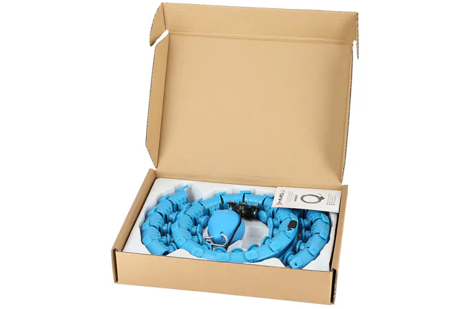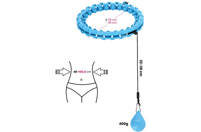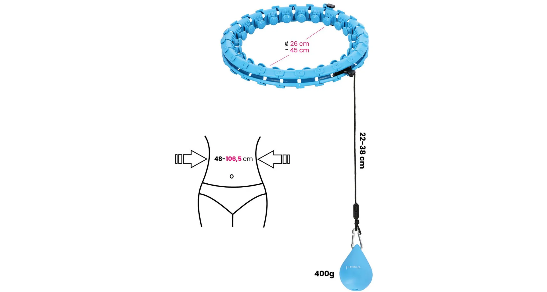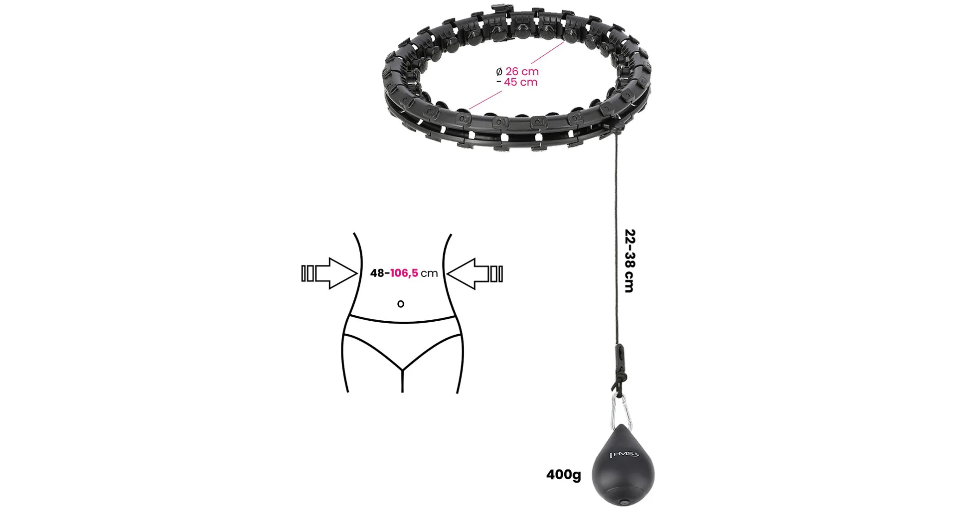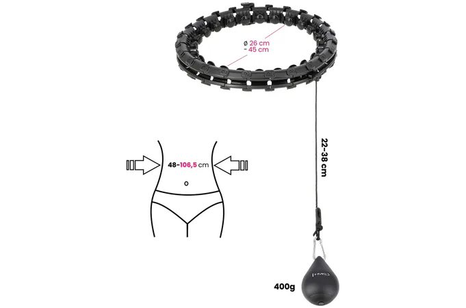 Obruč HHW01 je z vnitřní strany opatřena masážními kloboučky s pružinami, které tlumí vibrace od pohybující se kotvy a zároveň příjemně masírují oblast pasu. Intensitu tréninku ovlivňuje délka provázku a rychlost, jakou kroutíme boky.