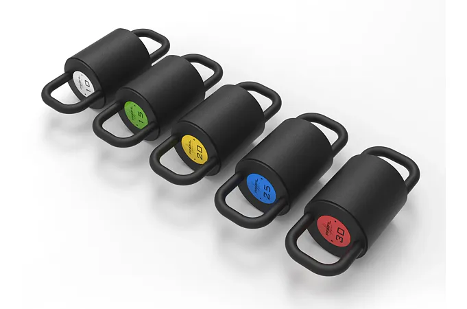 Činky Doublebell jsou dodávány v 5 hmotnostech od 10 do 30 kg. Všechny činky mají totožnou velikost, křivka pohybu tedy zůstává stejná, ať už zvedáte 10 kg nebo 30 kg činku.