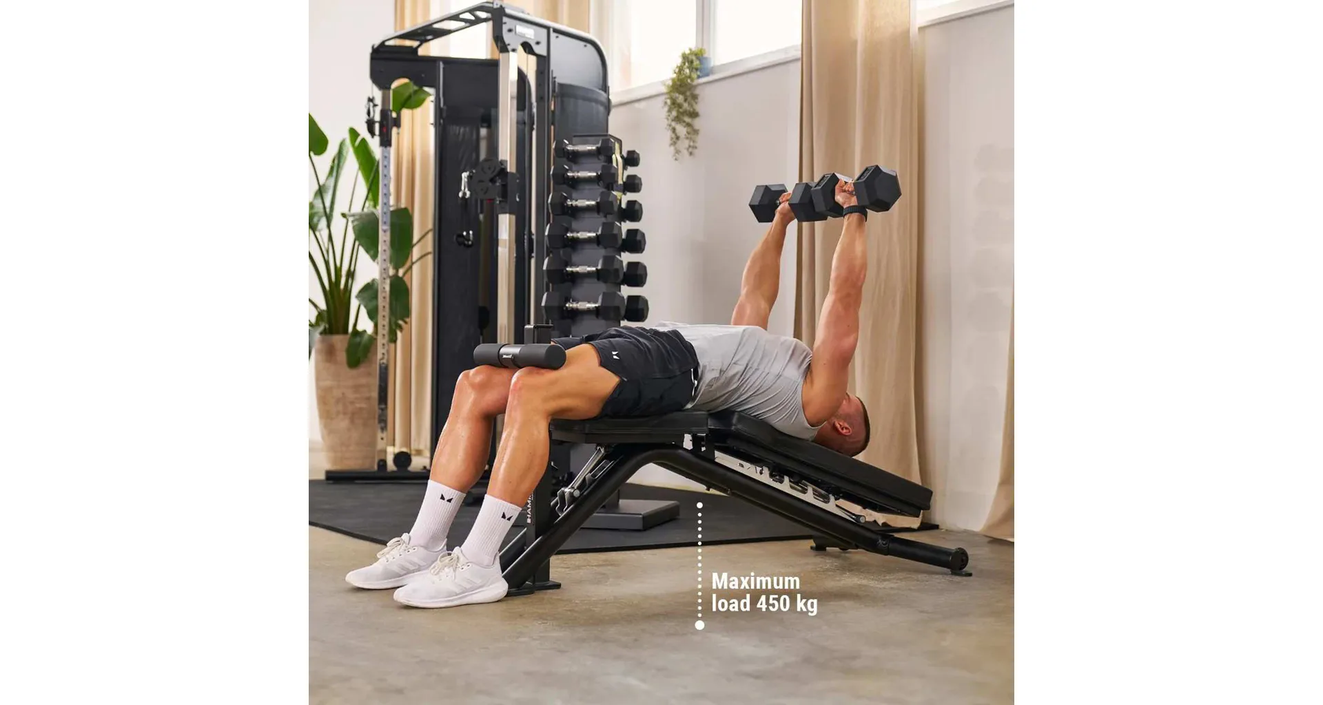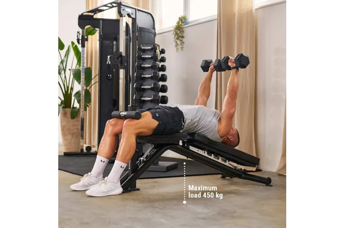 Nosnost lavice je díky její robustnosti až 450 kg (včetně závaží). Lavici lze snadno přesunout díky