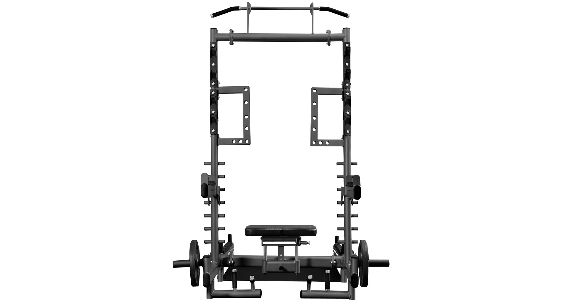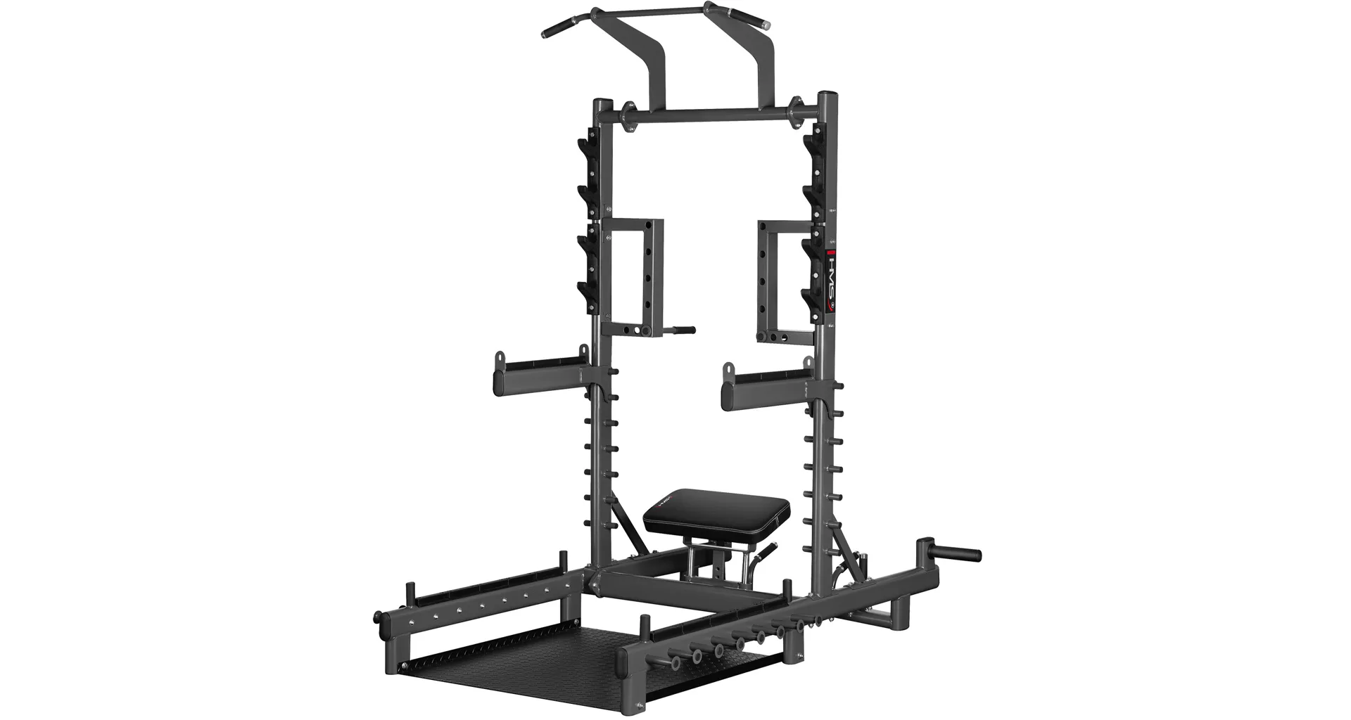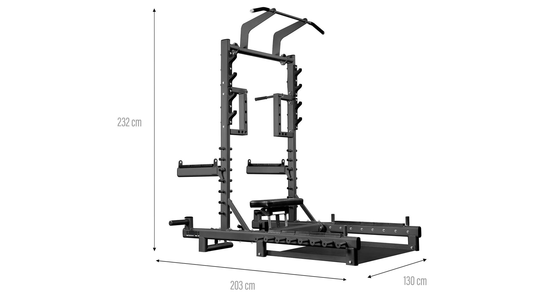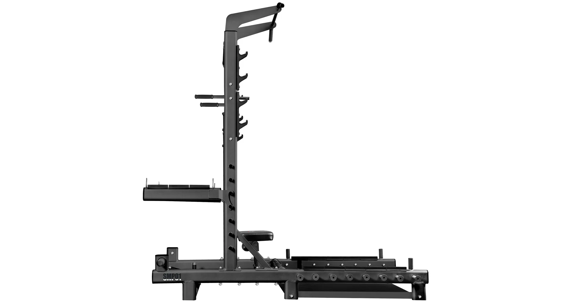 SMP01 je vaše nové tréninkové centrum, které vám umožní nejen provádět hip thrusty nebo mrtvý tah. Tento přístroj je navíc vybaven hrazdou na přítahy, úchyty na dipy, háky na činku, bezpečnostními zarážkami, trny na skladování závaží a čepy pro práci s odporovou gumou. Díky promyšlené konstrukci a širokým možnostem nastavení se SMP01 hodí jak do domácí posilovny, tak do pokročilejších tréninkových prostor.