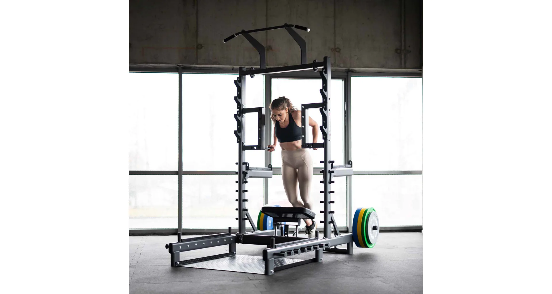 Díky úchytům na činku a pevným bezpečnostním zarážkám poskytuje SMP01 komfortní a bezpečné provádění dřepů s činkou a dalších cviků s těžkými váhami. Navíc dva trny na skladování kotoučů umožňují snadnou organizaci vybavení ve vaší tréninkové zóně.