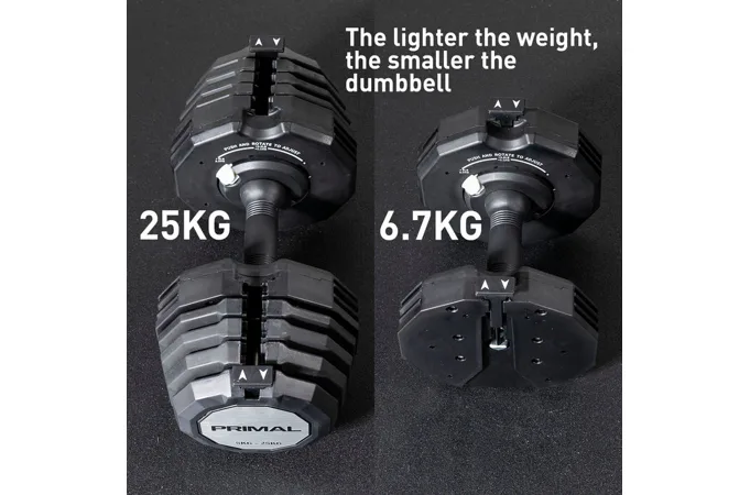 Jednoruční nakládací činka PRIMAL STRENGTH s praktickým řešením úpravy zátěže. Pomocí praktického nakládacího/vykládacího systému nebyla změna hmotnosti nikdy snazší. Vámi požadovanou váhu si můžete velmi jednoduše změnit pomocí posuvníku, kterým vyberete požadovanou hmotnost. K dalšímu přesnějšímu zvýšení, nebo snížení váhy slouží otočný mechanismus.