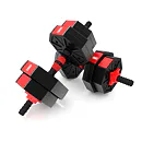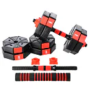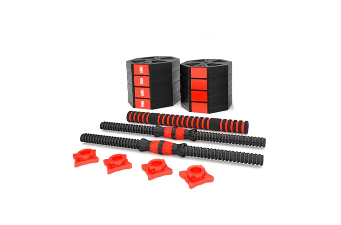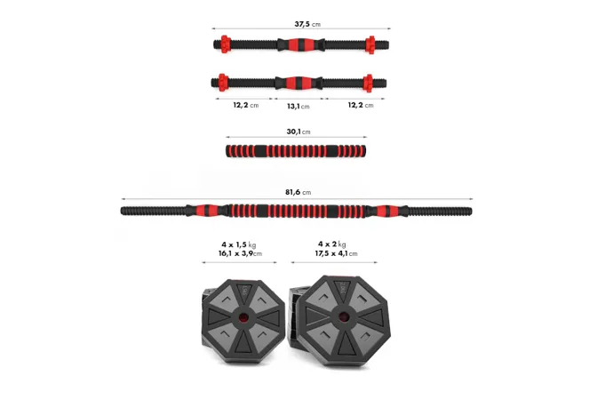 Kotouče jsou vyrobeny z trvdého plastu, který je vyplněn cementem. Obouruční osa je spojovacím dílem, do kterého se všroubují hřídele jednoručních činek. Nakládací trny jsou opatřeny závitem a závaží se zajišťuje pomocí hvězdicových matic. Šestihranný tvar kotoučů navíc zamezuje jejich odvalování. Činky se Vám tak nikam neodkutálí a budete je mít vždy tam, kde jste je odložily.