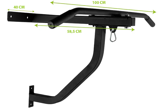 Nástěnná vzpěra má délku 40 cm a vzdálenost od stěny je 58,5 cm. Nástěnný držák na boxovací pytel VIRTUFIT s hrazdou velmi snadno připevníte s přiloženým montážním materiálem. Při montáži se ujistěte, že držák visí ve správné výšce a že můžete pohodlně používat jak boxovací pytel, tak hrazdu. Hrazda má délku 100 cm.