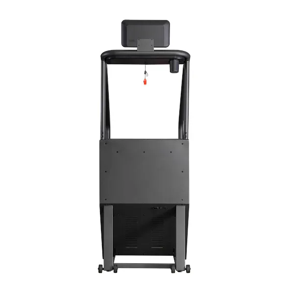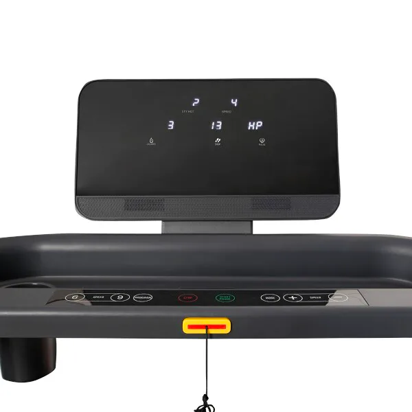 Trenažér je vybaven přehledným LED displejem, který během tréninku zobrazuje všechny údaje přehledně a čitelně. Pod displejem nalezneme 2 reproduktory, které reprodukují z hudbu přehrávanou z USB Flash disku a nebo z připojeného linkového vstupu (3,5 mm Jack). Když se posuneme o kousek níže, tak zde nalezneme poličku s výkrojem pro odložení lahve a ovládací prvky, které jsou pro maximální pohodlí spolu s elektrodami pro měření tepu umístěny také na madlech. Na levém madle najdeme tlačítka pro spuštění a zastavení pohybu schodů, zatímco na levém madle jsou tlačítka pro regulaci rychlosti.