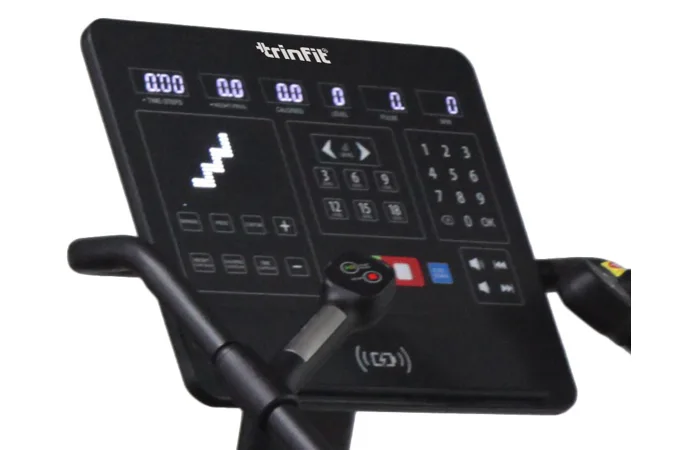 TRINFIT Stair Pro je vybavený intuitivní konzolí s LED displejem v 6 oknech, na kterých sledujete veškeré důležité hodnoty jako čas, kroky, vystoupanou výšku, tepovou frekvenci, úroveň odporu či spálené kalorie. Nechybí ani 36 přednastavených programů, uživatelské režimy, režim FAT, počítadlo kroků nebo kalorií a funkce CoolDown.