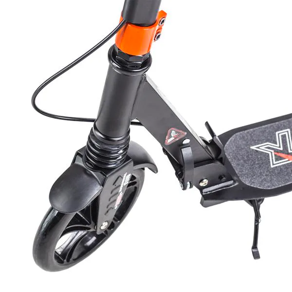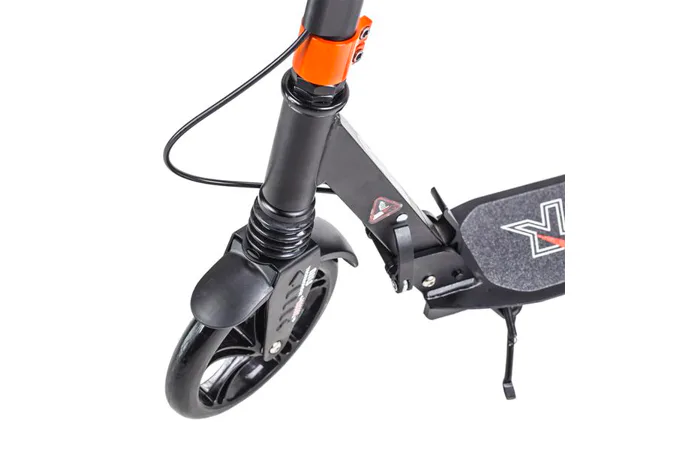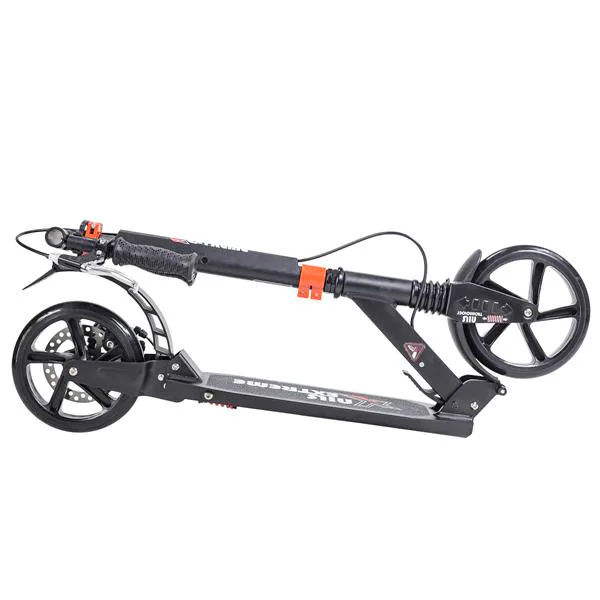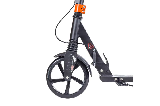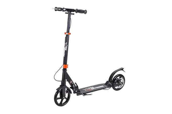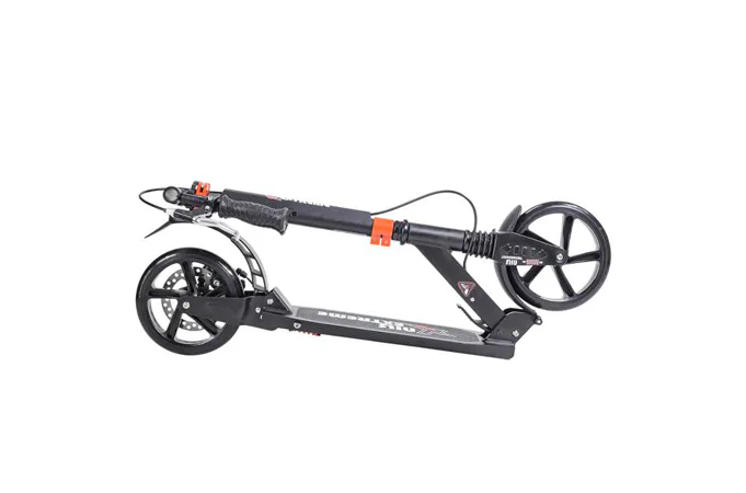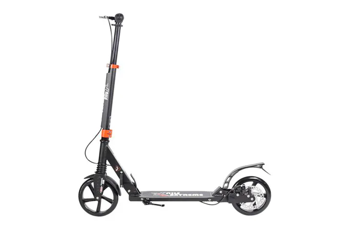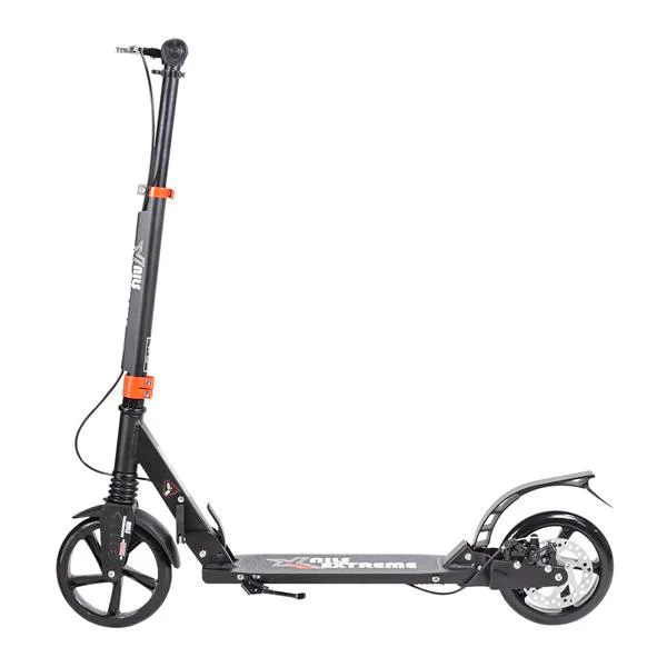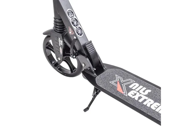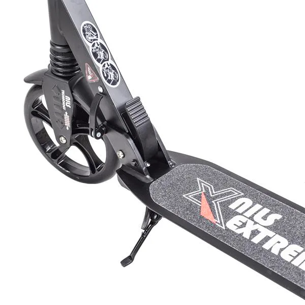 Skládací koloběžka značky NILS EXTREME HA200T je koloběžka určená pro celou rodinu. Charakteristickou vlastností koloběžky jsou dva tlumiče – přední svislý a zadní vodorovný, zajišťující větší komfort během jízdy, minimalizují drncání a pohlcují otřesy. Díky tomu se produkt dobře osvědčí při přejíždění nerovných povrchů. Široký a dlouhý nášlap je pokrytý protiskluzovým gripem zajišťujícím správnou přilnavost boty. Nastavitelná řídítka (až do výše 106 cm) umožňují přizpůsobit koloběžku k výšce dítěte nebo také zajišťují pohodlnou jízdu dospělým osobám. Nově je tento model vybaven také kotoučovou brzdou.