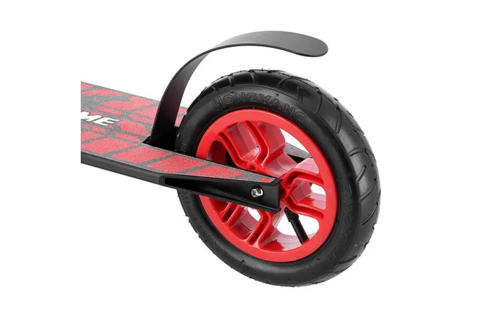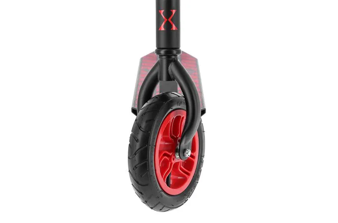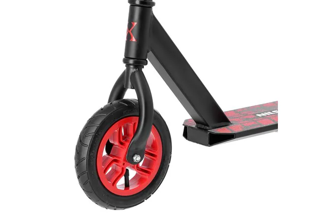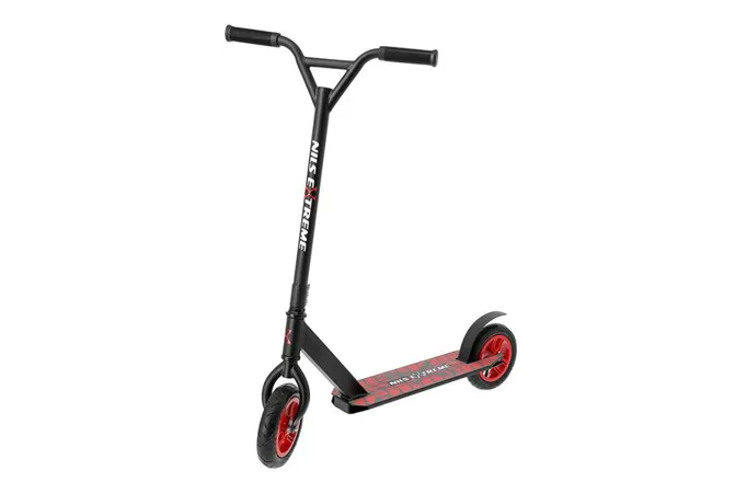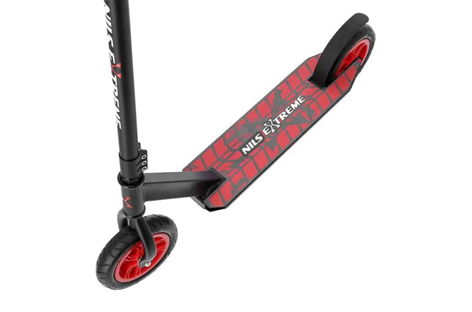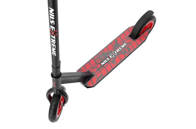 Koloběžka NILS Extreme HC020 je kombinací freestyle a terénní koloběžky. Díky pumpovaným kolečkům můžete triky provádět na růzých typech povrchů. Nylonová kolečka jsou osazeny ložisky ABEC 9 a pumpovací pneumatikou o průměru 200 mm. Model HC020 je vybaven přítlačnou brzdou (blatníkem) na zadním kole. Pevná konstrukce předurčuje koloběžku k provádění freestyle triků, při kterých využijete i možnost protáčení řídítek o 360°.