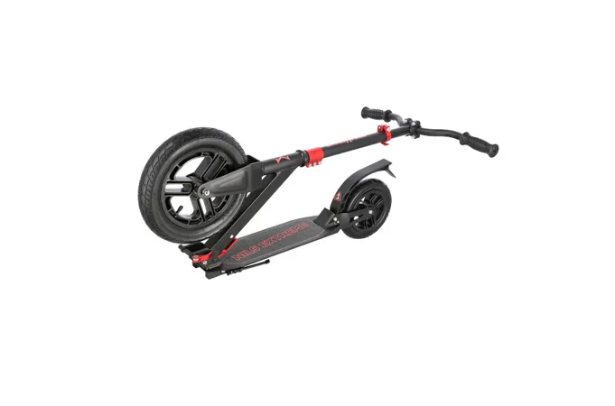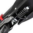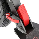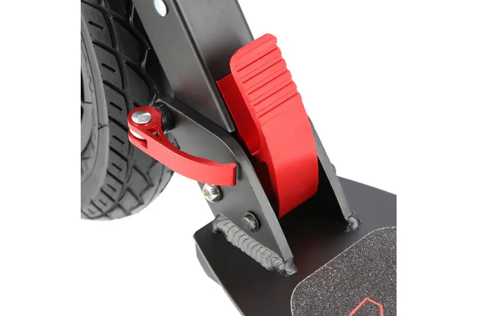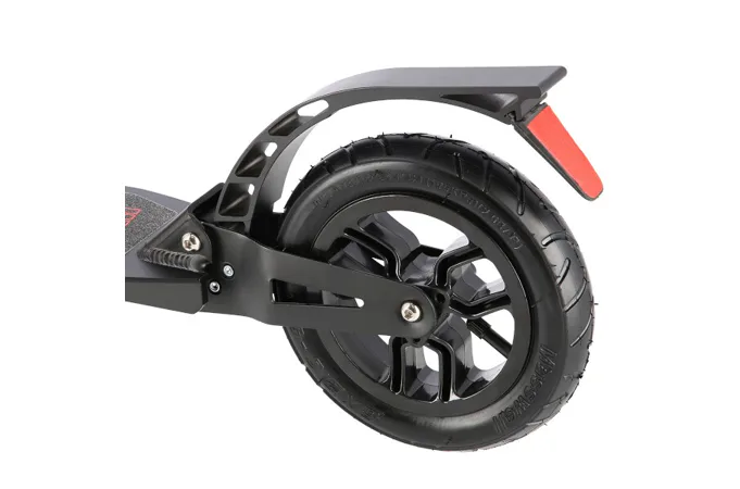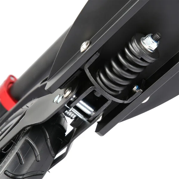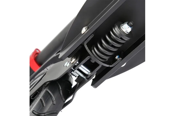 20-ti centimetrové zadní kolo je osazeno vodorovným tlumičem, které tak má téměř stejný účinek tlumení, jako 30-ti centimetrové přední kolo. Jako brzda slouží robustní, hliníkový blatník, který stačí pouze přišlápnout a koloběžka začne okamžitě zpomalovat.