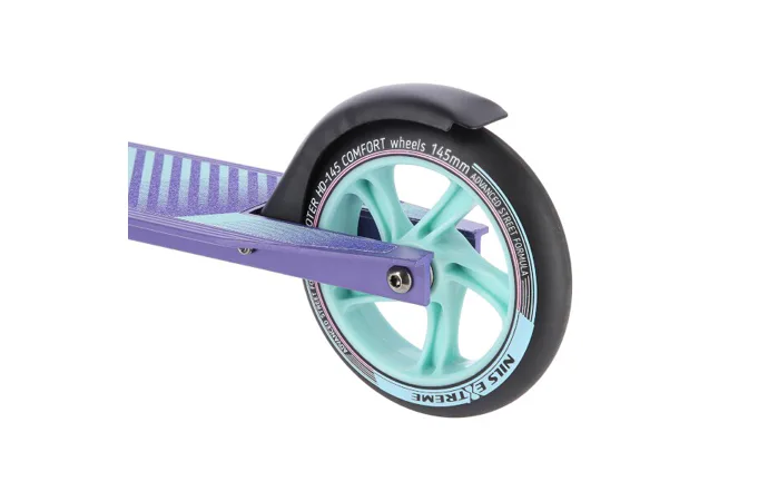 HD145 je vyrobena z hliníku, díky kterému je velice trvanlivá a lehká. Nízká hmotnost a možnost složení má také vliv na komfort přenášení, pokud s koloběžkou cestujete autobusem, tramvají, metrem a nebo pokud si ji vezmete s sebou například na dovolenou. Řídítka mají šířku 46 centimetrů a rukojeti jsou opatřeny gumovými gripy, tato kombinace zaručuje pohodlný úchyt a jistotu v řízení i při vysokých rychlostech, kterých HD145 dosahuje díky polyuretanovým kolečkům o průměru 145 mm a ložiskům ABEC 7. Kolečka jsou opatřeny blatníky, které Vás udrží v čistotě i v případě, že potřebujete projet louží, nebo Vás zastihne například dešťová přeháňka. Zadní blatník zároveň slouží jako nožní brzda, ta umožňuje rychlé zastavení a tím zvyšuje bezpečnost koloběžky.