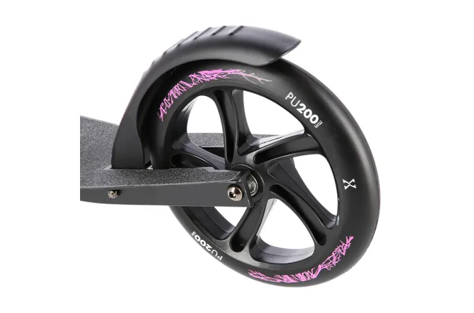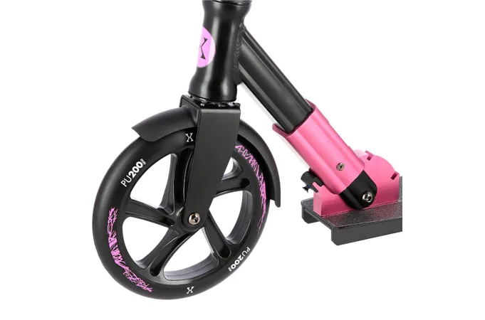 Zadní blatník slouží jako přítlačná brzda. Široká řídítka jsou opatřena gumovými rukojeťmi, které zajišťují pevný a pohodlný úchop. 200 milimetrů velká kola jsou osazena ložisky ABEC 9. Tato kombinace zajišťuje rychlou, plynulou a bezpečnou jízdu. Blatník na předním kole a skládací stojánek jsou drobnostmi, které přispívají k maximálnímu možnému komfortu z jízdy a k celkové radosti ze samotného používání modelu MH205.