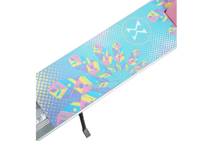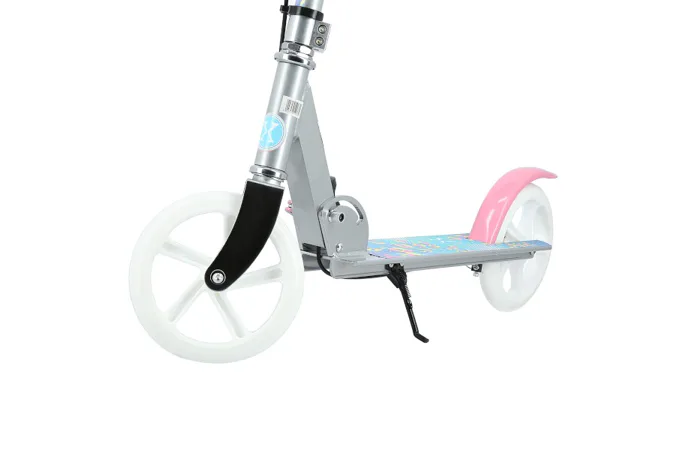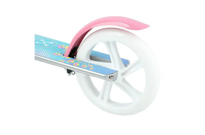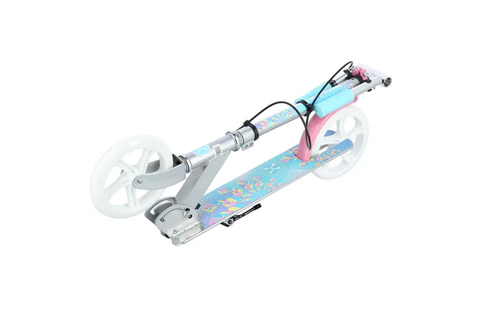 Zadní blatník slouží jako nožní, přítlačná brzda, pod blatníkem se skrývá samostatná, malá brzda, která je ovládána páčkou z řídítek. Řídítka jsou opatřena gumovými rukojeťmi, které zajišťují pevný a pohodlný úchop. Velká kola jsou osazena ložisky ABEC 7. Tato kombinace zajišťuje plynulou a bezpečnou jízdu. Na levé straně nášlapu se nachází sklopný stojánek.