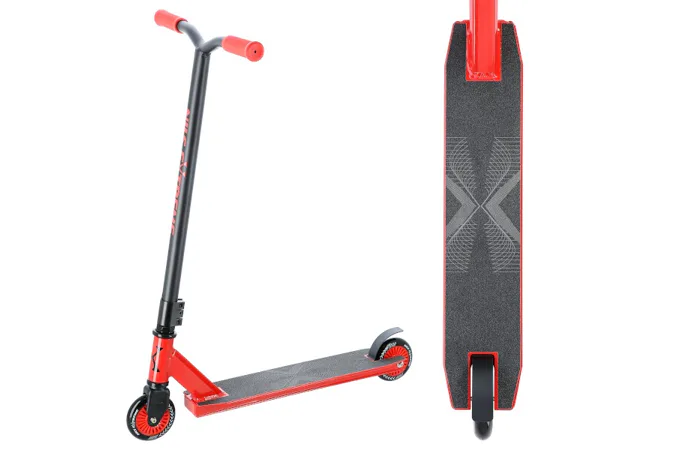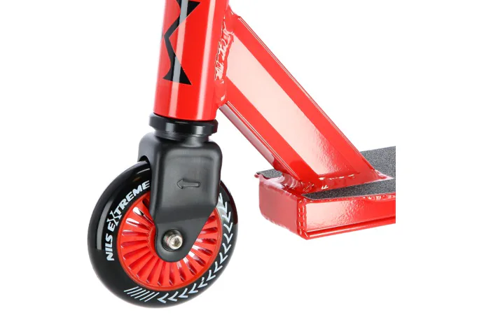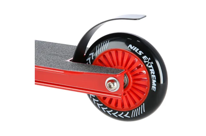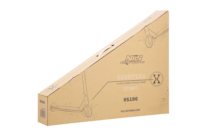 NILS Extreme HS106 je freestyle koloběžka s nosností 100 kg a je tak vhodná jak pro děti, tak pro dospělé. Konstrukce je vyrobena ze silné a trvanlivé oceli, platforma je z hliníku. Model HS106 je vhodný na asfalt a dlažbu. Kolečka o rozměru 100 x 24 mm jsou osazeny ložisky ABEC 7, bezpečnost zaručuje zadní přítlačná (blatník) brzda - takzvaný Flexi fender. NILS Extreme HS106 je díky malým, rychlým kolečkům, robustní, pevné kostrukci a řídítkům protáčejícím se o 360° určena k provádění triků.