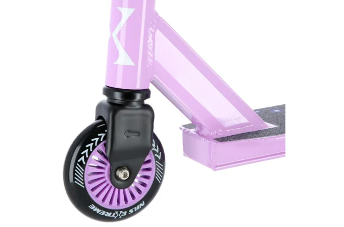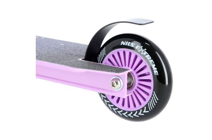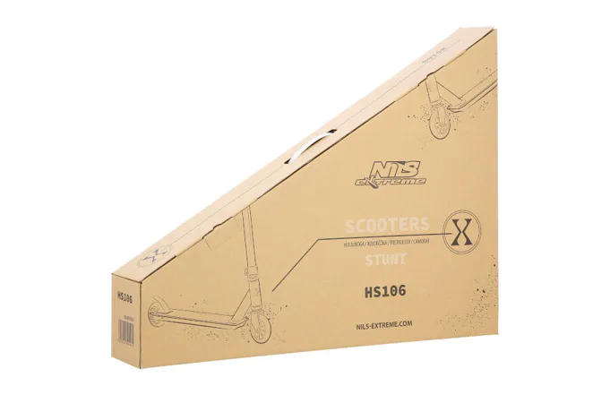 NILS Extreme HS106 je freestyle koloběžka s nosností 100 kg a je tak vhodná jak pro děti, tak pro dospělé. Konstrukce je vyrobena ze silné a trvanlivé oceli, platforma je z hliníku. Model HS106 je vhodný na asfalt a dlažbu. Kolečka o rozměru 100 x 24 mm jsou osazeny ložisky ABEC 7, bezpečnost zaručuje zadní přítlačná (blatník) brzda - takzvaný Flexi fender. NILS Extreme HS106 je díky malým, rychlým kolečkům, robustní, pevné konstrukci a řídítkům protáčejícím se o 360° určena k provádění triků.