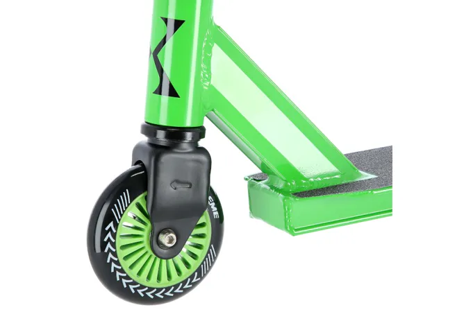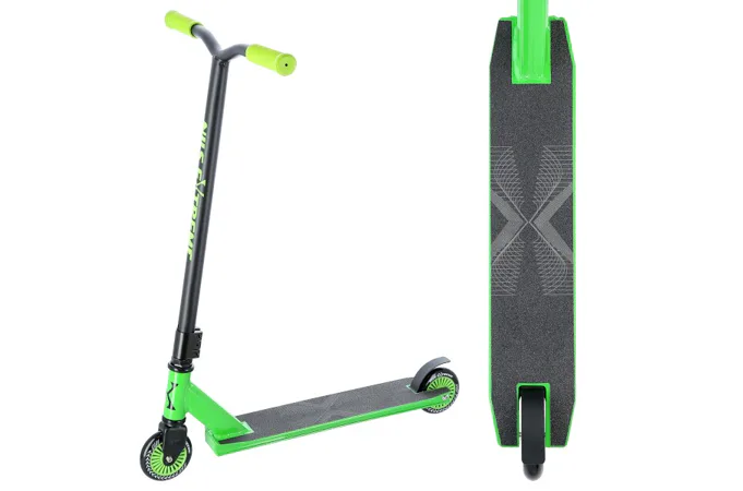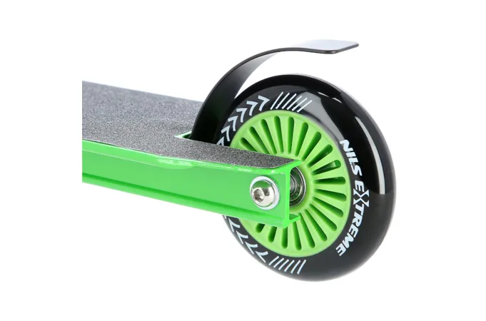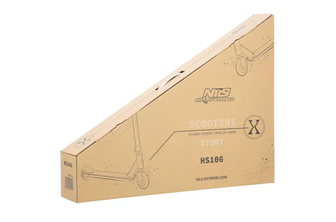 NILS Extreme HS106 je freestyle koloběžka s nosností 100 kg a je tak vhodná jak pro děti, tak pro dospělé. Konstrukce je vyrobena ze silné a trvanlivé oceli, platforma je z hliníku. Model HS106 je vhodný na asfalt a dlažbu. Kolečka o rozměru 100 x 24 mm jsou osazeny ložisky ABEC 7, bezpečnost zaručuje zadní přítlačná (blatník) brzda - takzvaný Flexi fender. NILS Extreme HS106 je díky malým, rychlým kolečkům, robustní, pevné kostrukci a řídítkům protáčejícím se o 360° určena k provádění triků.