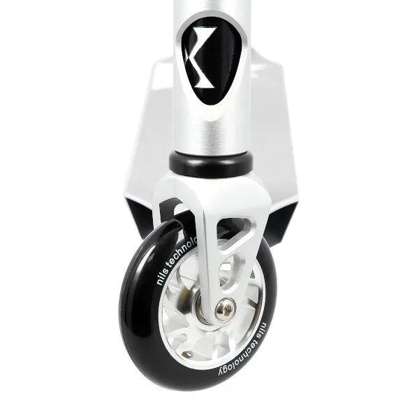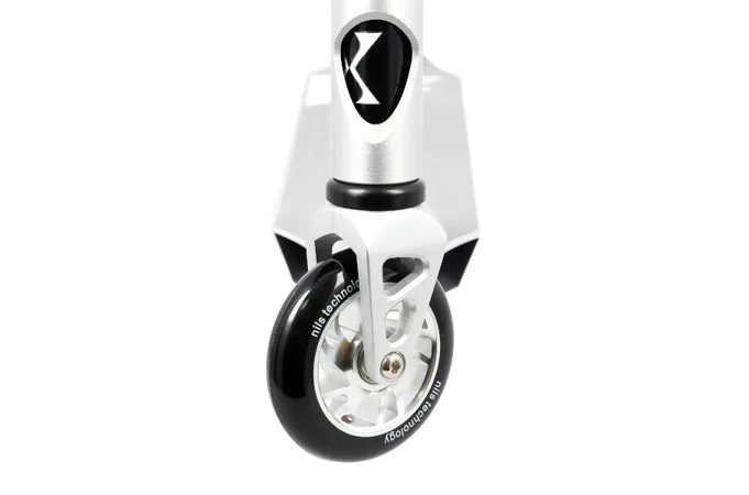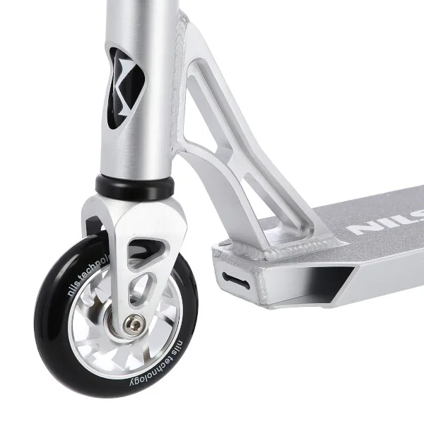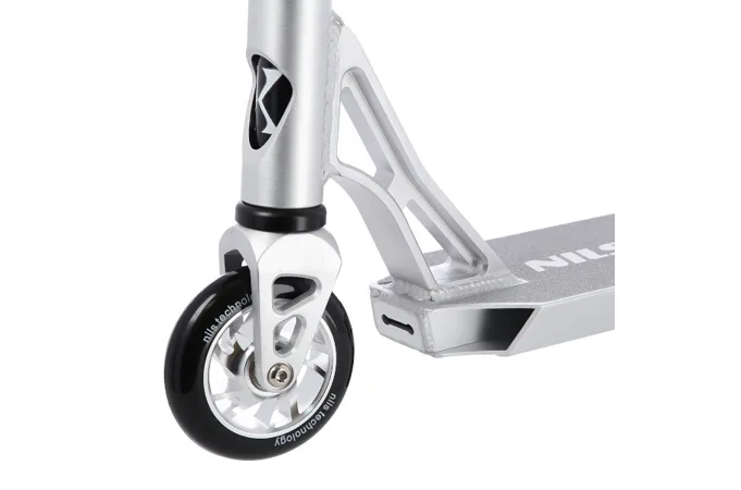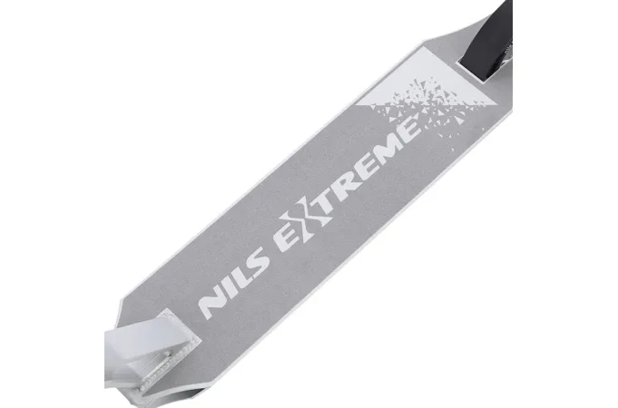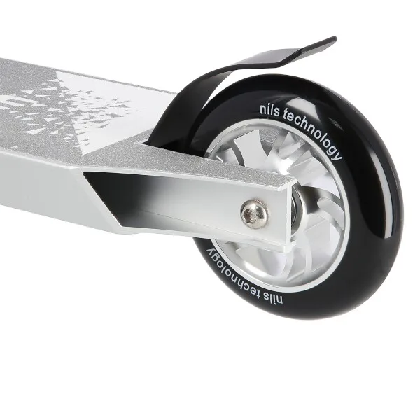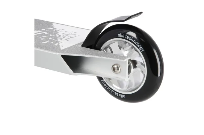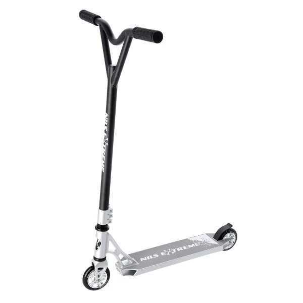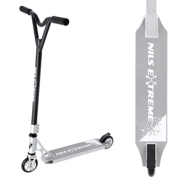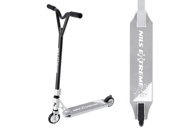 NILS Extreme HS120 je freestyle koloběžka s nosností 100 kg a je tak vhodná jak pro děti, tak pro dospělé. Konstrukce je vyrobena ze silné a trvanlivé oceli. Model HS120 je vhodný na asfalt a dlažbu. Kolečka o rozměru 100 x 24 mm jsou osazeny ložisky ABEC 9, bezpečnost zaručuje zadní přítlačná (blatník) brzda. NILS Extreme HS120 je díky malým, rychlým kolečkům, robustní, pevné konstrukci a řídítkům protáčejícím se o 360° určena k provádění triků.